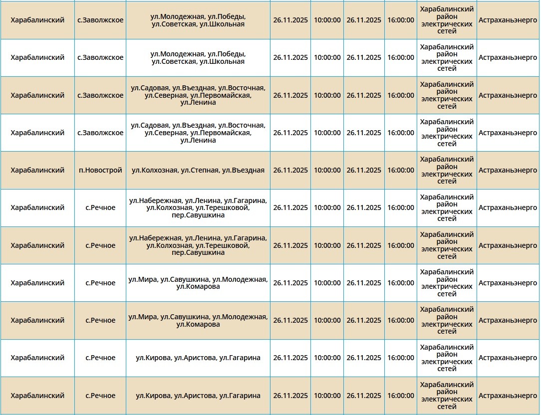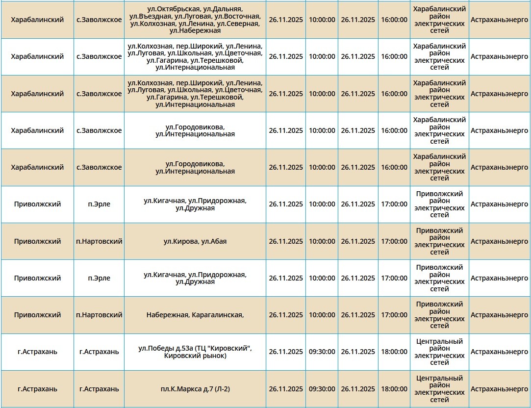 26 ноября на территории Астраханской области запланированы отключения электричества. Так, без света останутся, в том числе, Кировский рынок, а также несколько школ и детских садов. Отключения пройдут как в самом городе Астрахань, так и в Ахтубинском, Харабалинском и Икрянинском районах. Самые ранние отключения начнутся в 08:00. Подробнее со списком адресов можно ознакомиться в галерее ниже: Кстати, информацию обо всех коммунальных проблемах нашего города вы можете найти здесь. На этом сайте, в режиме реального времени, можно наблюдать за отключениями света, воды и т.д. А если отключения случились внепланово, звоните по телефонам, которые указаны на фото: