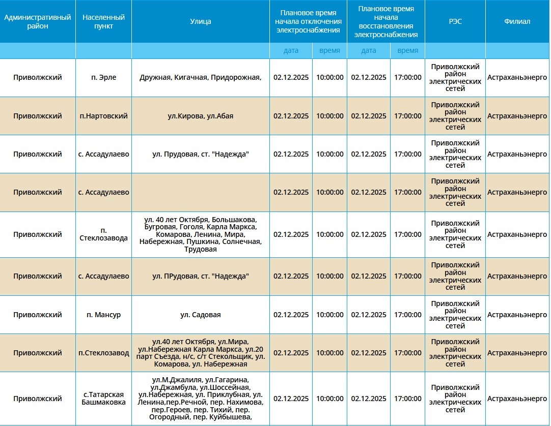 Завтра в Астраханской области продолжатся плановые работы на электросетях, в связи с чем многие абоненты останутся без электроэнергии. Так, жителей города Астрахань, а также Приволжского района ждут плановые отключения электричества. Самые ранние отключения начнутся в 08:00 и продолжатся около 10 часов. Полный список адресов можно увидеть ниже: А информацию обо всех коммунальных проблемах нашего города вы можете найти здесь. На этом сайте, в режиме реального времени, вы можете наблюдать за отключениями света, воды и т.д. Если отключения произошли внепланово, звоните по телефонам, которые указаны ниже:
