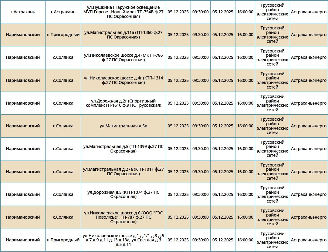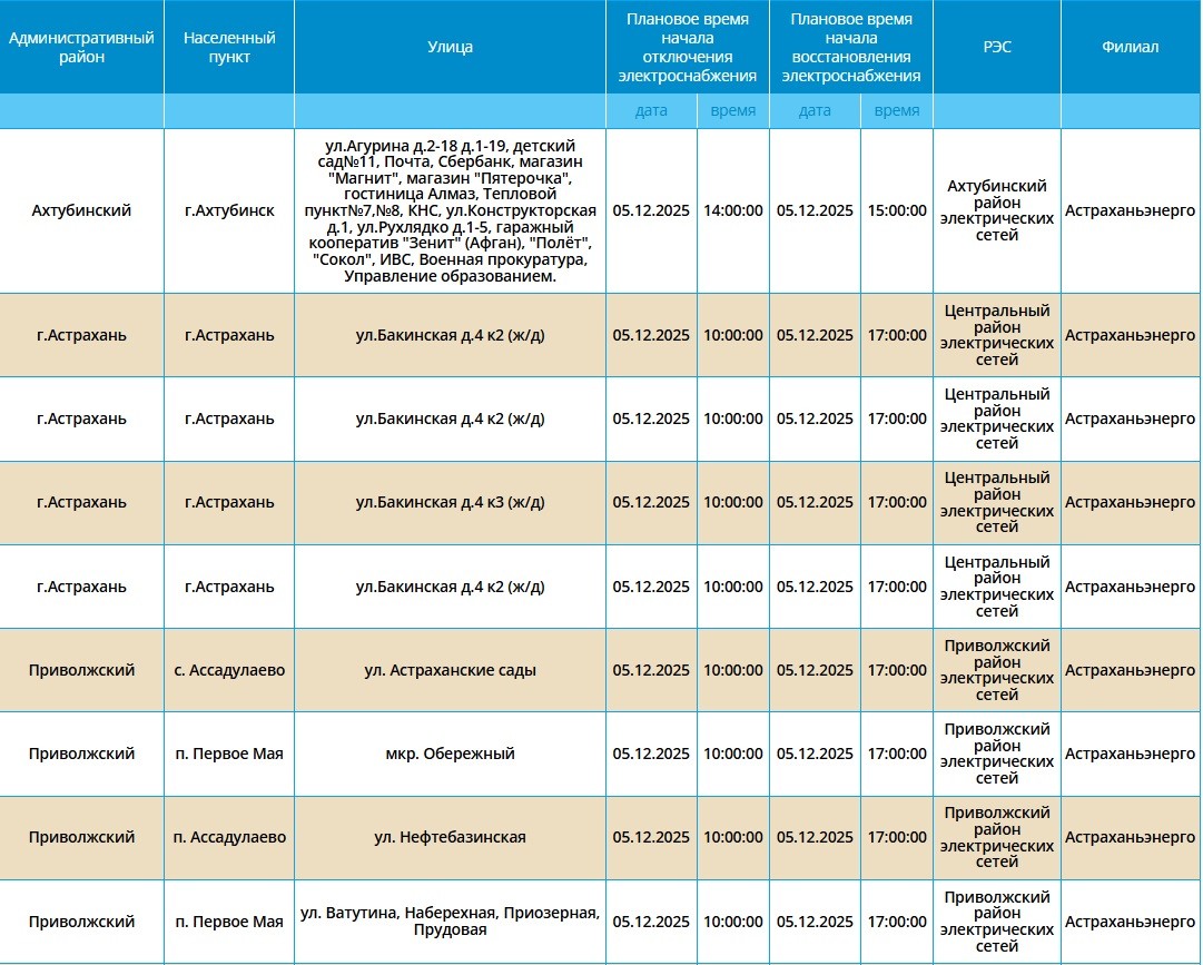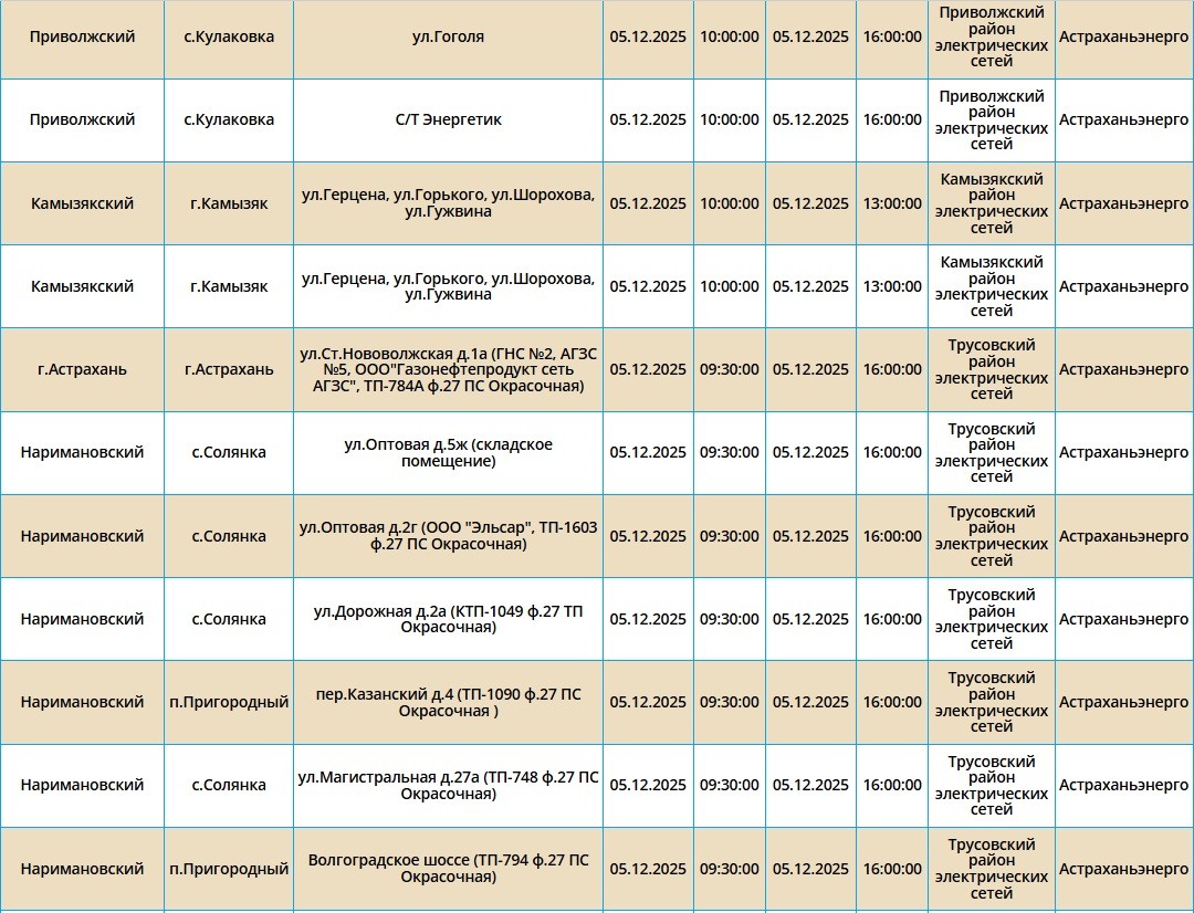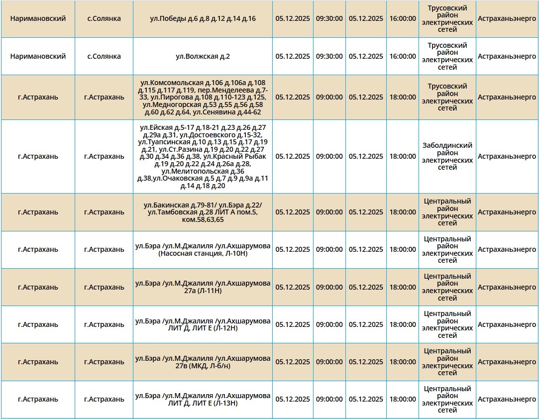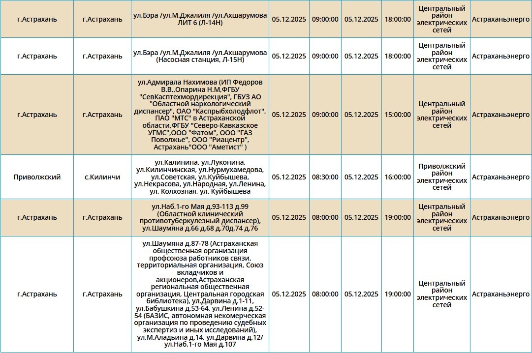 В эту пятницу, 5 декабря, по нескольким адресам в городе Астрахань и четырех районах области пройдут плановые отключения электроэнергии. Об этом сообщили в ПАО «Россети Юг». Так, света не будет в областном центре, а также в Ахтубинском, Приволжском, Камызякском и Наримановском районах. Без электроэнергии останутся сотни жилых домов, административные здания и социальные учреждения. Полный список адресов смотрите в галерее ниже: Всю необходимую информацию о текущих коммунальных проблемах в нашем городе вы найдете на этой карте. Здесь оперативно обновляются данные о перебоях с электричеством, водоснабжением и прочими бытовыми неудобствами. При возникновении непредвиденных отключений обращайтесь по следующим номерам телефонов: