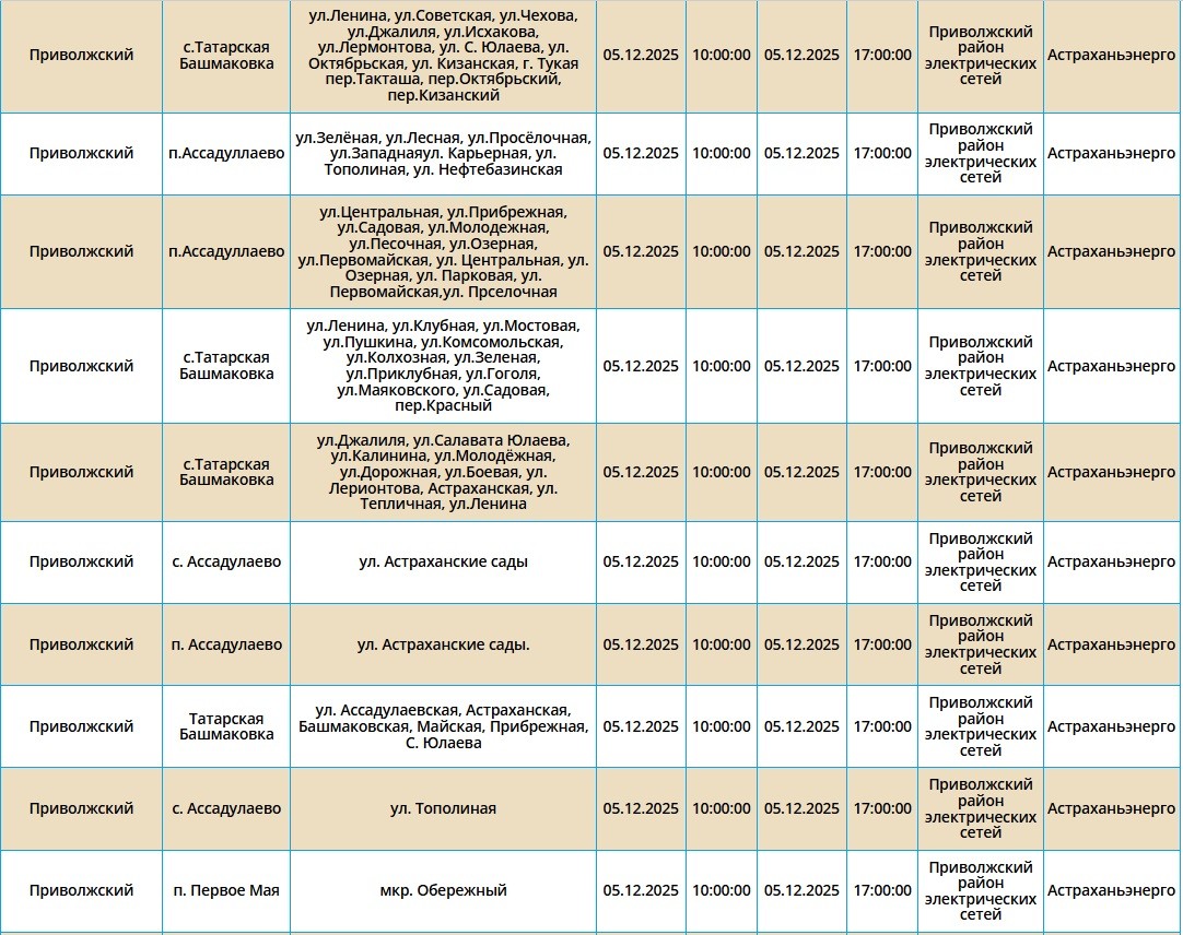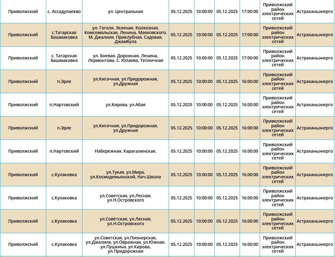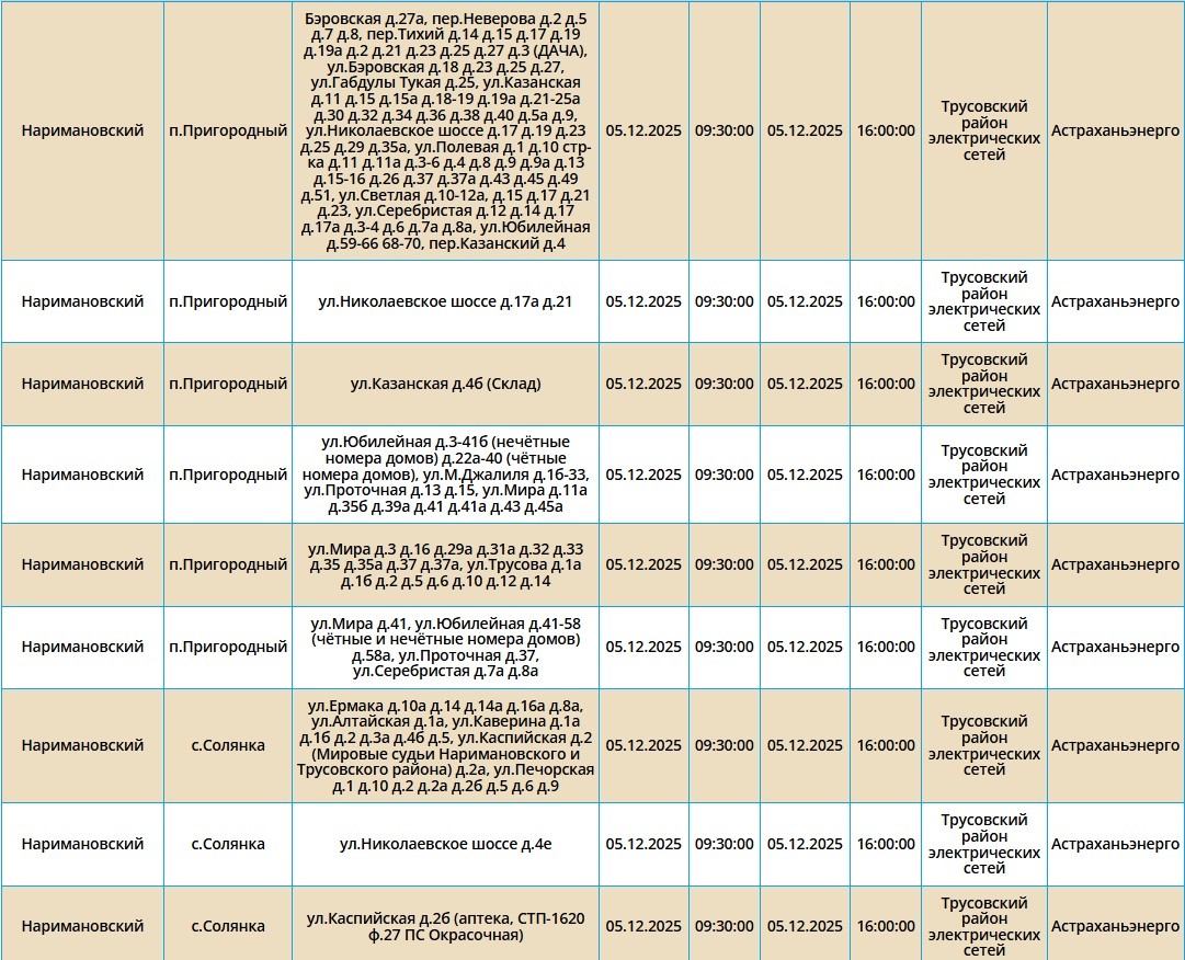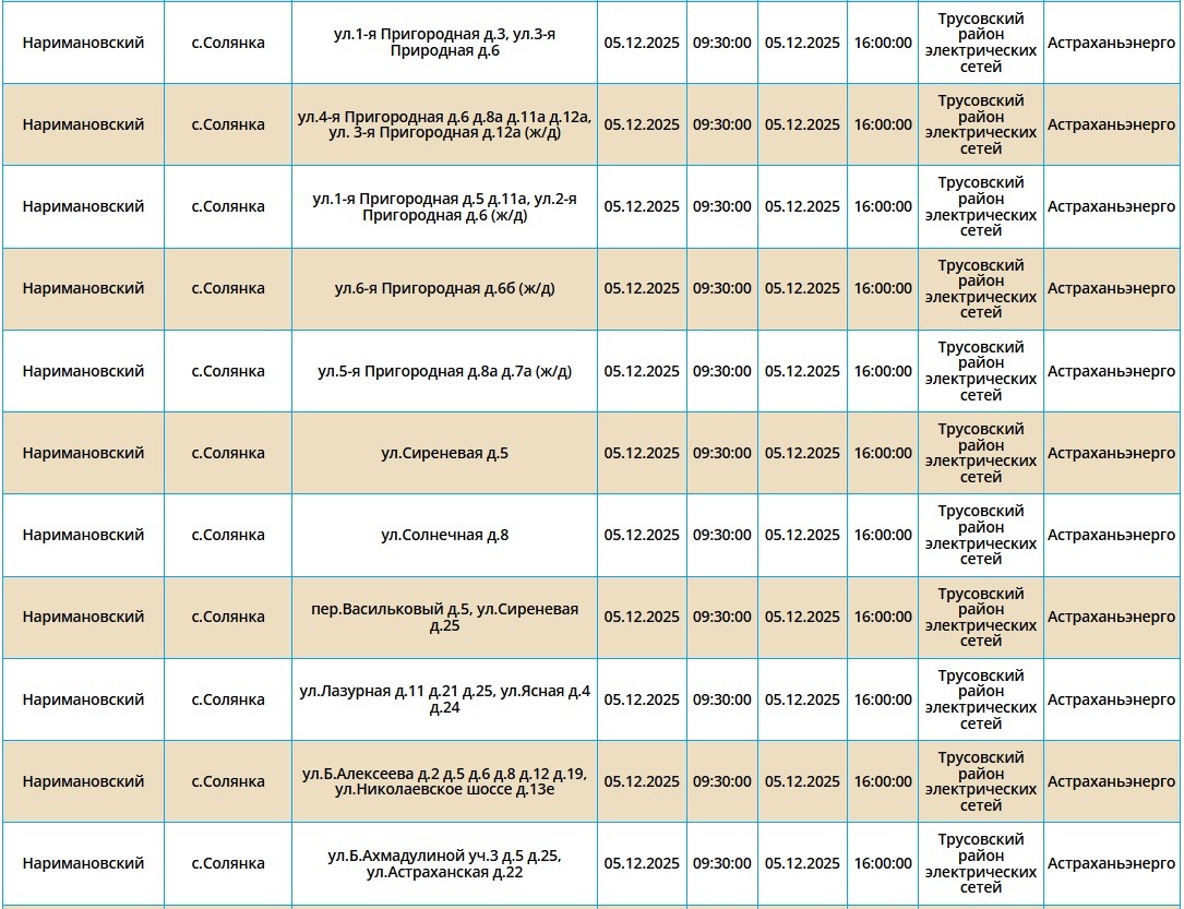 В эту пятницу, 5 декабря, по нескольким адресам в городе Астрахань и четырех районах области пройдут плановые отключения электроэнергии. Об этом сообщили в ПАО «Россети Юг». Так, света не будет в областном центре, а также в Ахтубинском, Приволжском, Камызякском и Наримановском районах. Без электроэнергии останутся сотни жилых домов, административные здания и социальные учреждения. Полный список адресов смотрите в галерее ниже: Всю необходимую информацию о текущих коммунальных проблемах в нашем городе вы найдете на этой карте. Здесь оперативно обновляются данные о перебоях с электричеством, водоснабжением и прочими бытовыми неудобствами. При возникновении непредвиденных отключений обращайтесь по следующим номерам телефонов: