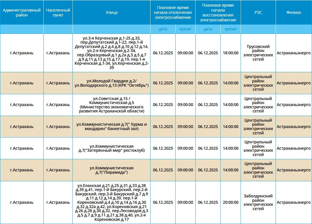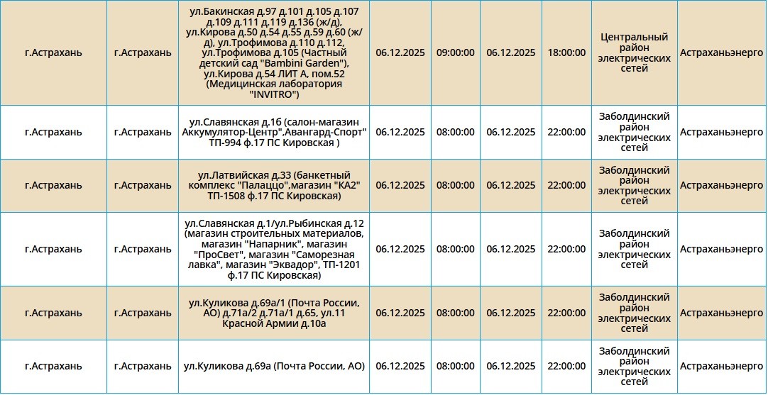 6 декабря на территории города Астрахань пройдут плановые отключения электричества, об этом сообщили сотрудники ПАО «Россети Юг». Отключения затронут только жителей областного центра. Самые ранние начнутся в 08:00 и продолжатся около 14 часов. Полный список адресов смотрите в галерее ниже: А информацию обо всех коммунальных проблемах нашего города вы можете найти здесь. На этом сайте, в режиме реального времени, вы можете наблюдать за отключениями света, воды и т.д. Если отключения произошли внепланово, звоните по телефонам, которые указаны ниже: