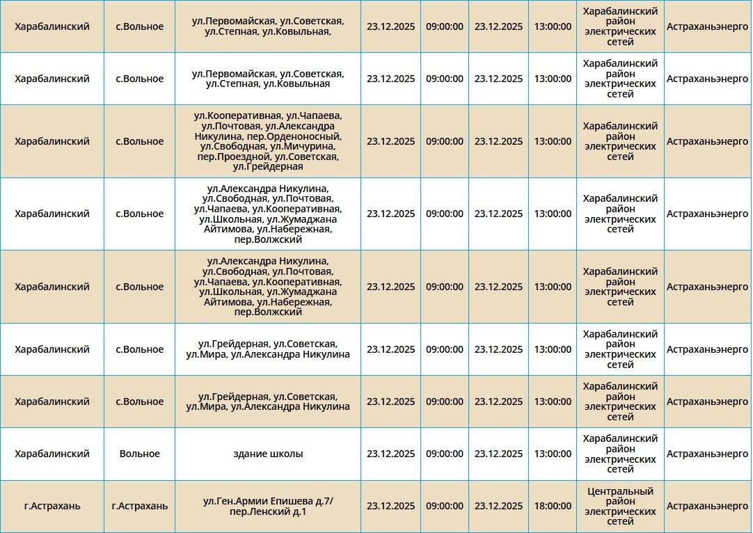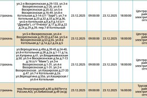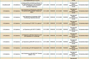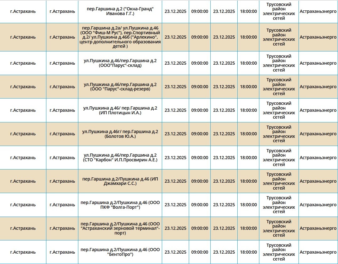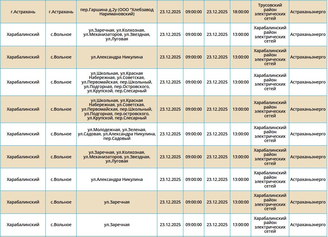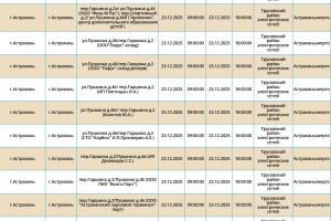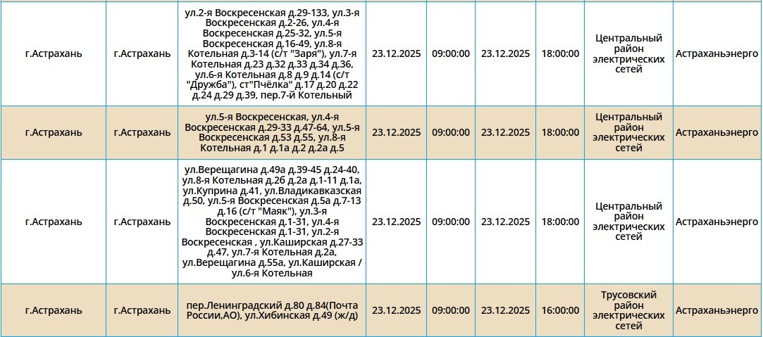Согласно сообщению пресс-службы ПАО «Россети Юг», 23 декабря запланированы временные отключения электроэнергии в Астраханской области. Эти мероприятия охватывают ряд населенных пунктов, включая Астрахань, а также Ахтубинский и Харабалинский районы. Свет будет отсутствовать преимущественно с 09:00, но будут и более поздние отключения. Подробнее со списком адресов можно ознакомиться в галерее ниже: Также напоминаем, что удобнее всего следить за актуальной информацией о перебоях с электричеством, водоснабжением и прочими бытовыми неудобствами на интерактивной карте города. А в случае, если отключения произошли незапланированно, обращайтесь по указанным ниже номерам телефонов: