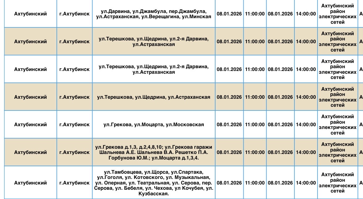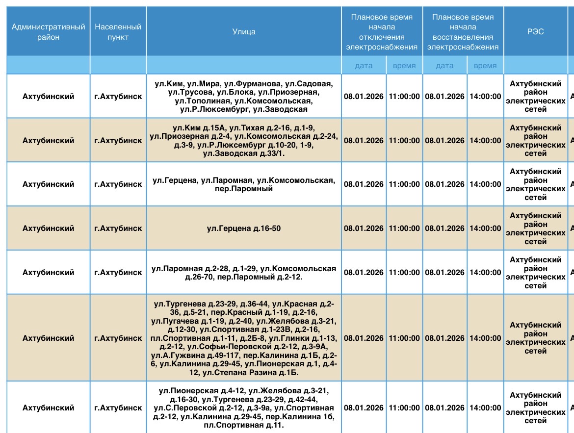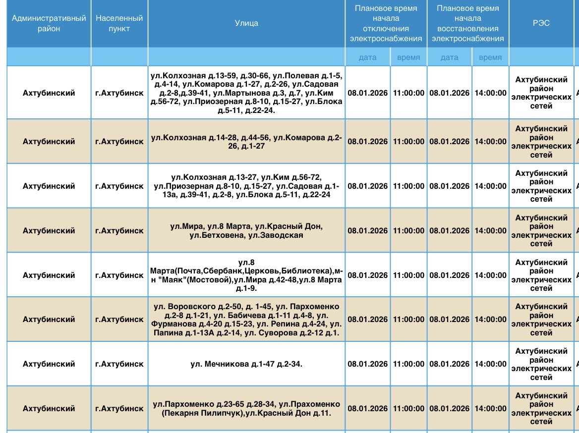 В пресс-службе ПАО «Россети Юг» сообщили о плановых отключениях электроэнергии, которые пройдут в регионе уже завтра, 8 января. Электричества не будет в Ахтубинском районе области. Без света останутся жилые дома, магазины, пункт приема шкур, церковь, библиотека и многое другое. Подробности ниже: Напоминаем, что оперативную информацию о проблемах с электроэнергией, водой и другими коммунальными услугами проще всего отслеживать на интерактивной городской карте. Если же сбои случились неожиданно, сообщайте по приведенным далее контактным телефонам: