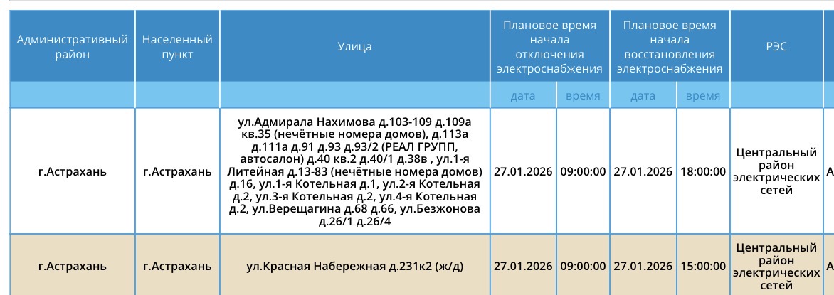 27 января автосалон и жилые дома в Астрахани останутся без света26 января 2026 года, 20:40
