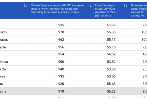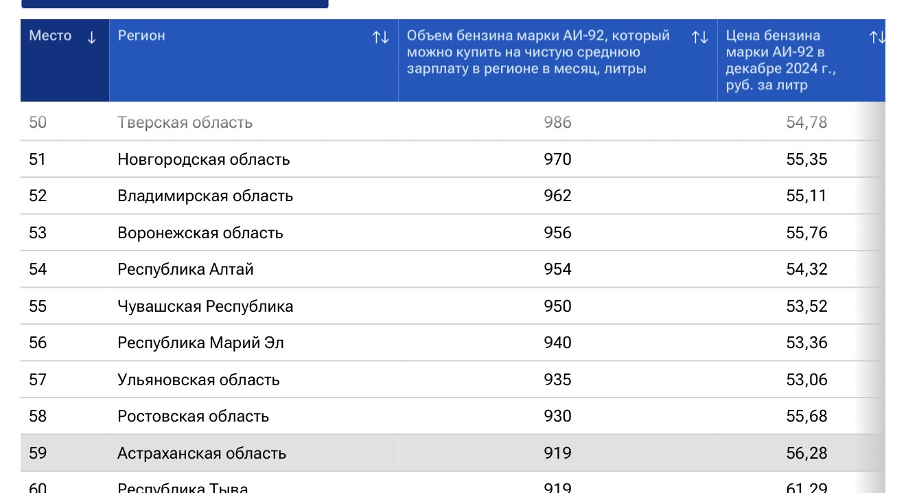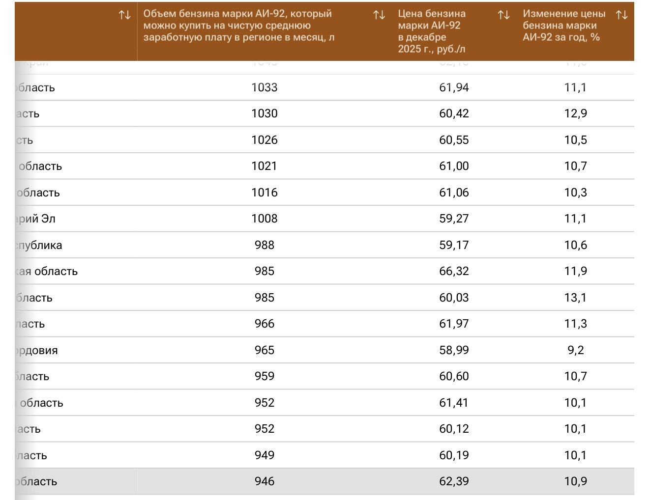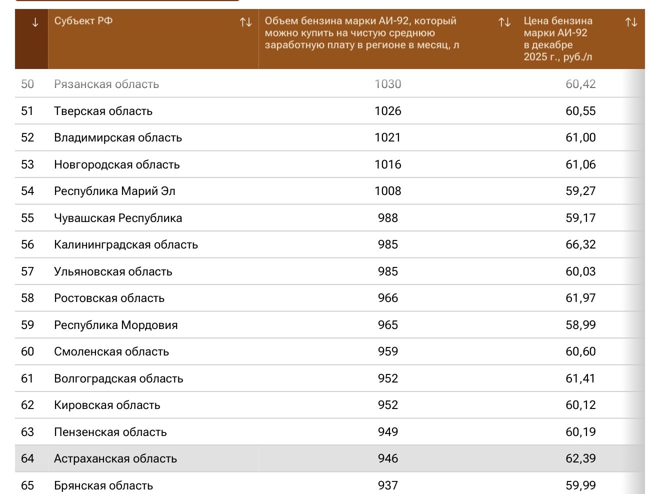 Аналитики «РИА Новости» подготовили интересный рейтинг регионов Российской Федерации по доступности бензина в 2026 году. Астраханская область оказалась в середине рейтинга. Начнем с лидеров. Ими традиционно стали Москва, Чукотский и Ямало-Ненецкий автономные округа. Там на среднюю зарплату можно приобрести более двух тысяч литров бензина марки АИ-92 в месяц, при общероссийском уровне 1393 литра. Вместе с тем стало все больше регионов, в которых на заработную плату водители могут приобрести не более 1500 литров бензина. Таких субъектов - 42. Стоимость бензина в декабре 2025 года в 85 субъектах РФ была выше, чем в декабре 2024 года. В целом по России рост цен на бензин марки А-92 составил 11%, что в два раза больше уровня инфляции. Наиболее существенно цены выросли в Республике Дагестан, Забайкальском крае и Республике Алтай. Во всех регионах стоимость бензина выросла на величину, превышающую уровень инфляции, а в шести регионах это превышение составляет более трех раз. В 2026 году рост цен продолжится, динамика стоимости вернется в общий инфляционный коридор при условии нормальной работы НПЗ. Также важен мониторинг со стороны регулирующих органов. Кроме того, сохраняется запрет на экспорт бензина. Поэтому, можно надеяться, что рост цен по итогам текущего года не превысит 5%. Сейчас Астраханская область заняла 64 место из 85 возможных. На среднюю зарплату по региону можно купить 946 литров топлива. За год бензин подорожал на 10,9%. В прошлом году ситуация была следующая. Астраханская область занимала 59 место, купить местные жители могли 919 литров бензина при стоимости литра АИ-92 - 56,28 рубля. С 2024 по 2025 годы цена выросла на 8,6%. В данный момент цены на топливо следующие: Нечто странное происходит с ценами на бензин в Астраханской области
