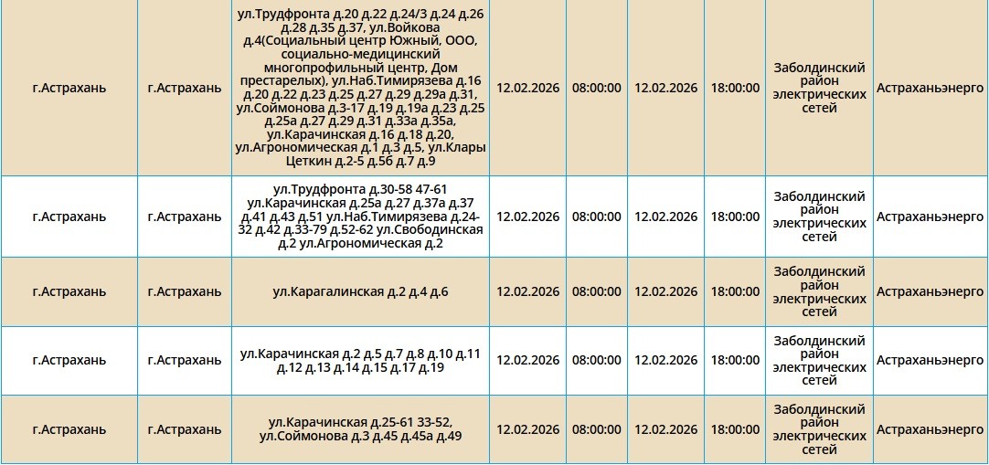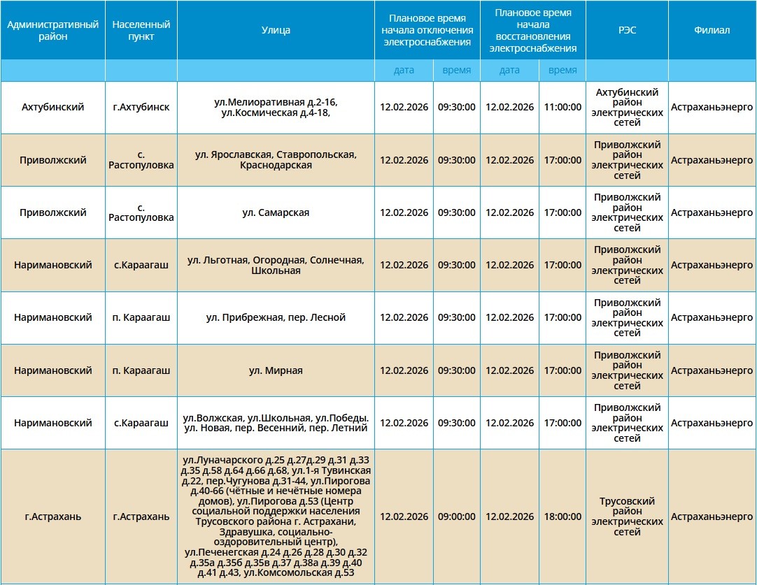 12 февраля в Астрахани, Ахтубинске и двух селах отключат электроэнергию11 февраля 2026 года, 20:30