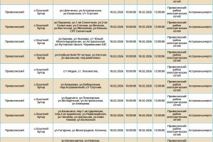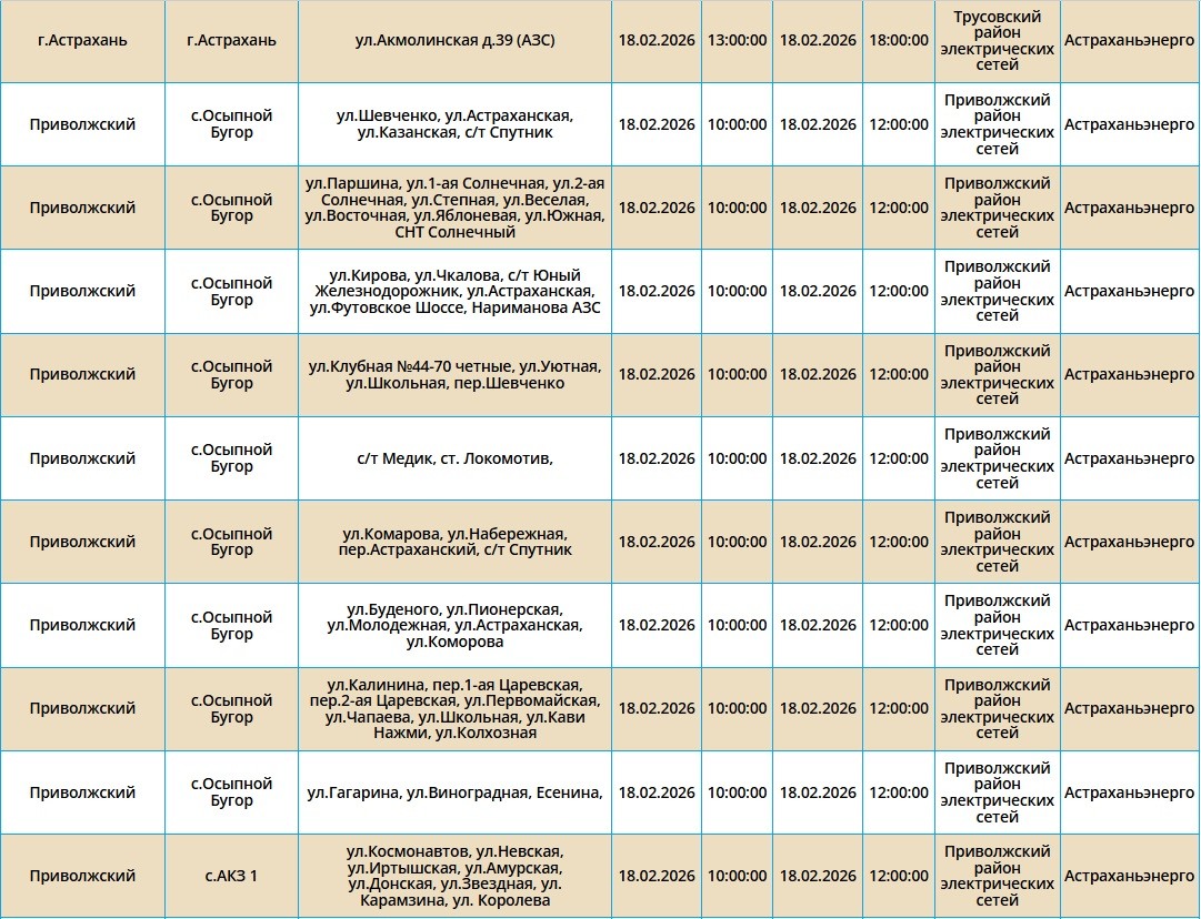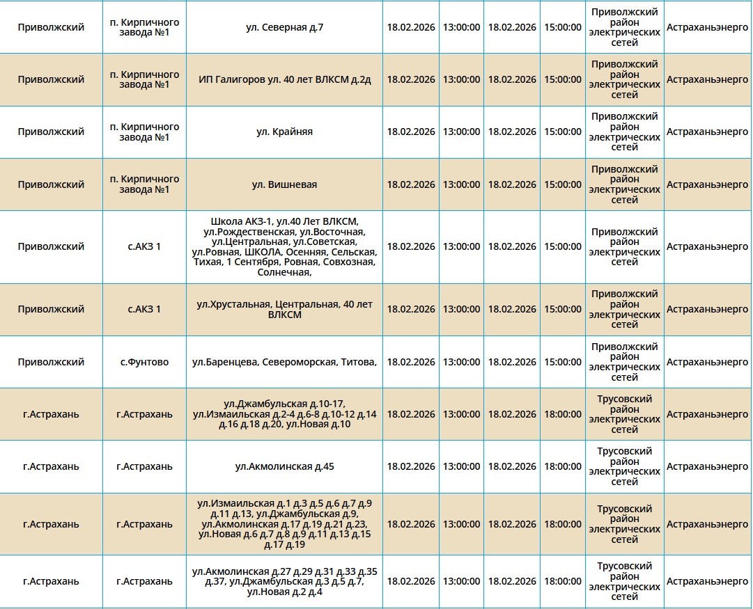 Жителям Астраханской области стоит подготовиться: в среду, 18 февраля, в регионе запланированы отключения электроэнергии. Как сообщили в Россети Юг, свет временно отключат из-за плановых работ на электросетях. Специалисты будут проводить обслуживание оборудования, чтобы повысить надежность электроснабжения. Отключения затронут не только Астрахань, но и несколько районов области - Приволжский, Ахтубинский и Икрянинский. Самые ранние отключения начнутся уже в 08:00. Полный список адресов, попадающих под ограничения, можно посмотреть в галерее ниже: Напомним, что все коммунальные отключения в городе отображаются на интерактивной карте. Там в режиме онлайн можно отследить ситуацию с электроэнергией, водоснабжением и другими услугами. Если возникнут внештатные ситуации или вопросы, жителям рекомендуют обращаться по указанным телефонам экстренных служб и ресурсоснабжающих организаций: