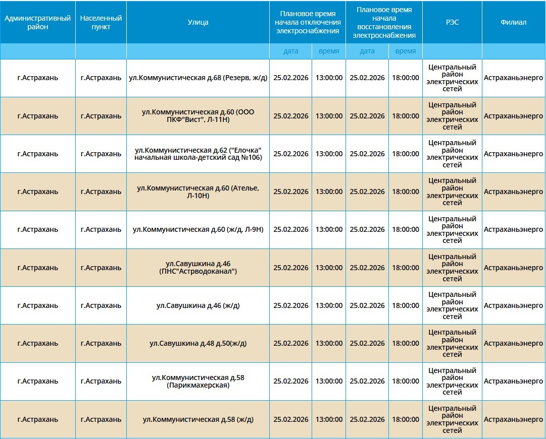 В пресс-службе ПАО «Россети Юг» сообщили о плановых отключениях электроэнергии, которые пройдут в регионе уже завтра, 25 февраля. В частности они затронут жителей города Астрахань, а также Приволжского, Ахтубинского и Камызякского районов. Так, без электроэнергии, помимо жителей Астрахани и Ахтубинска, останутся жители сел Тузуклей и Бирюковка. Самые ранние отключения начнутся уже в 09:00. А полный список адресов доступен в галерее ниже: Напоминаем, что оперативную информацию о проблемах с электроэнергией, водой и другими коммунальными услугами проще всего отслеживать на интерактивной городской карте. Если же сбои случились неожиданно, сообщайте по приведенным далее контактным телефонам: