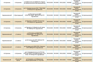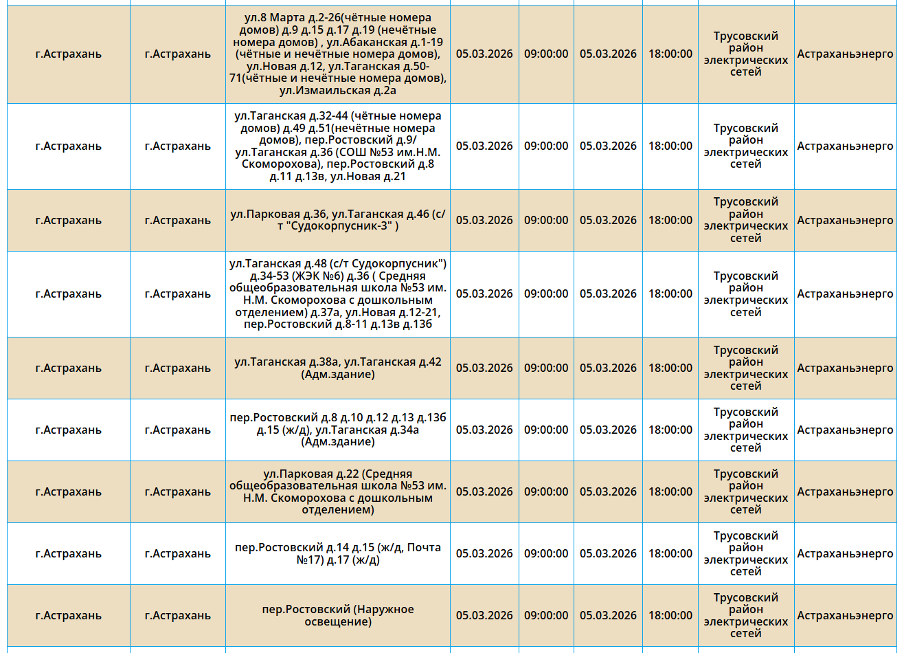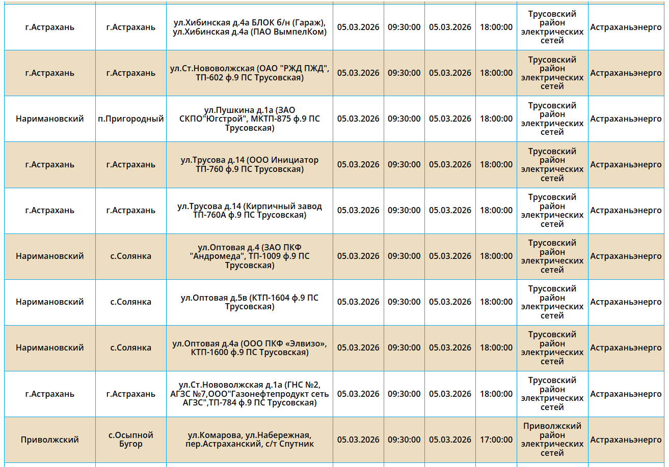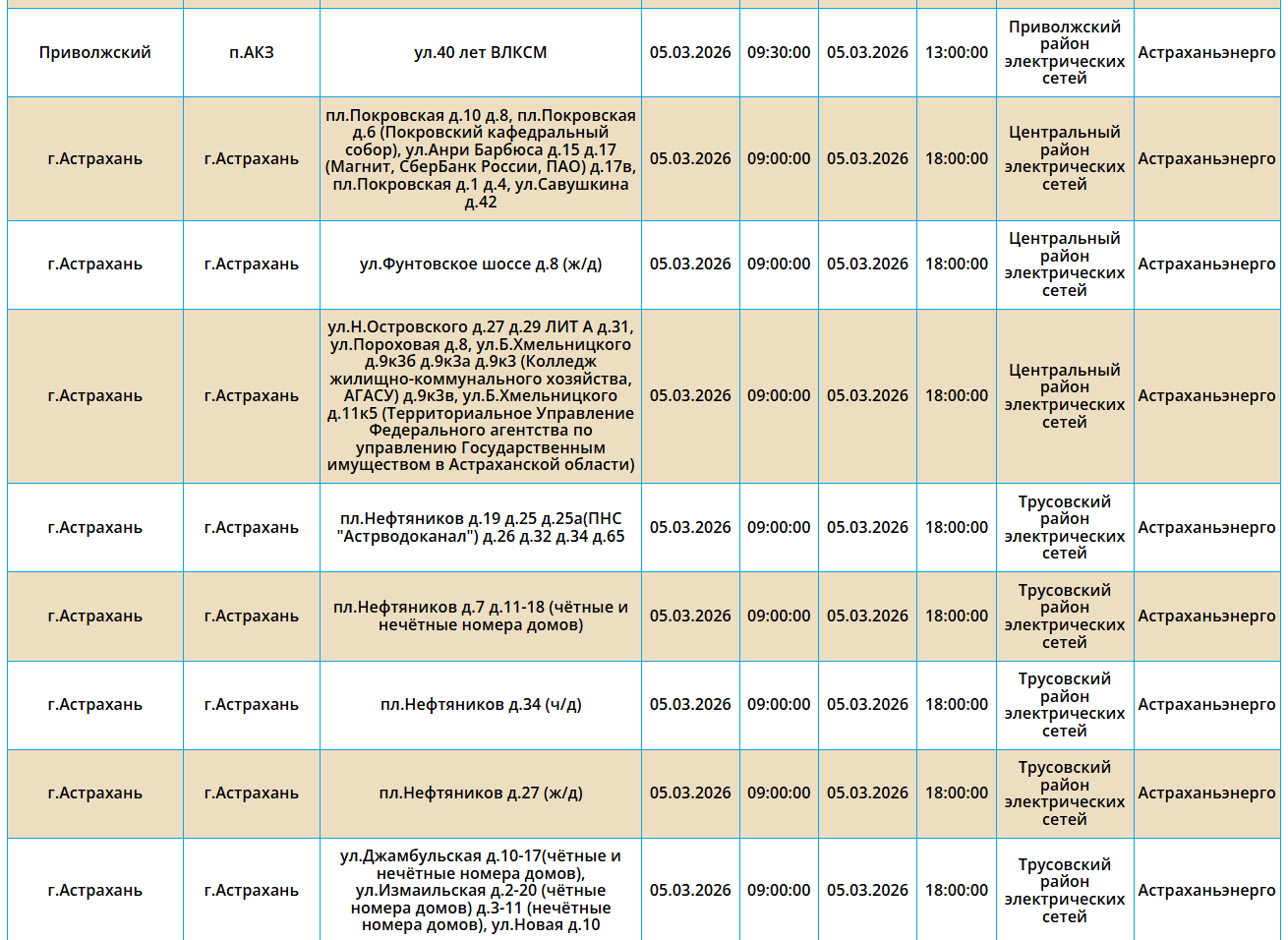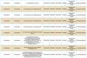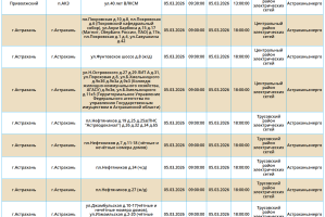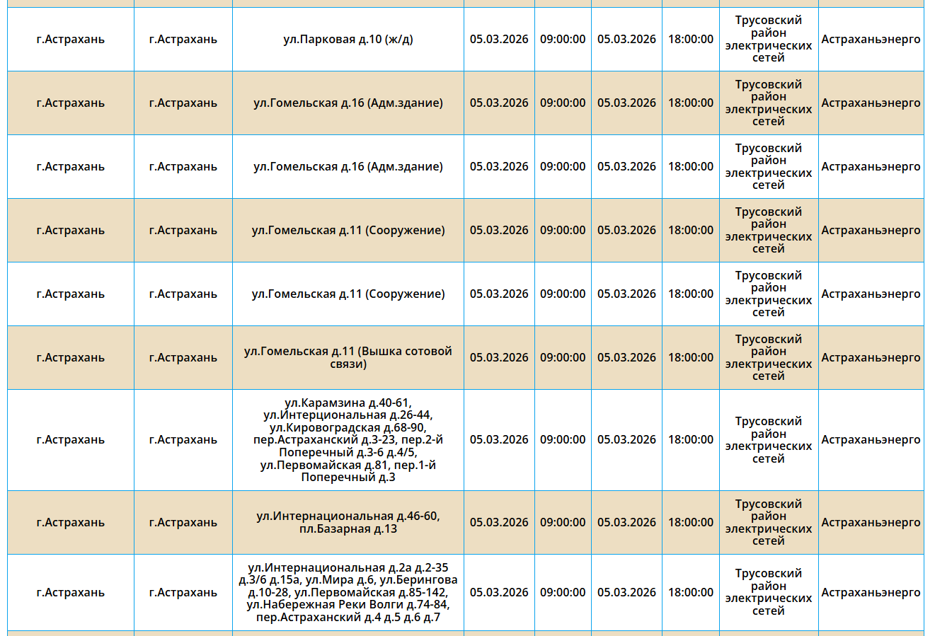 Завтра электроэнергии временно не будет в административных зданиях и жилых домах. Стало известно расписание плановых отключений электроэнергии, запланированных на завтра, 5 марта. В галерее ниже вы можете узнать точные адреса и продолжительность перерывов в подаче электричества для жителей Астрахани, а также Ахтубинского, Приволжского и Наримановского районов. А все коммунальные проблемы нашего города отображаются на этой интерактивной карте. Вы можете следить за ситуацией с отключением электроэнергии, водоснабжения и других услуг в режиме онлайн. В случае возникновения непредвиденных ситуаций обращайтесь по представленным контактным номерам телефонов: