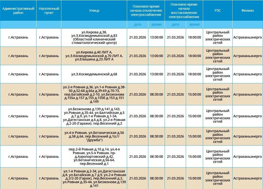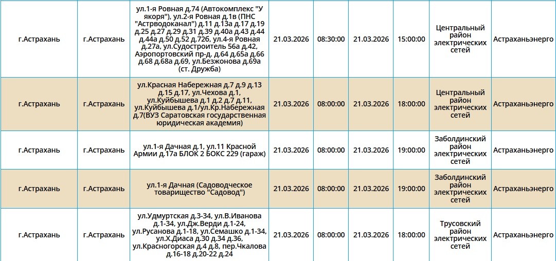 В эту субботу, 21 марта, в Астрахани пройдут очередные плановые отключения электроэнергии. Отключения пройдут в городе Астрахань. На несколько часов без света останутся жилые дома и административные учреждения областного центра. В одном районе отключения начнутся в 13:00, а где-то уже в 08:00. Подробности в галерее ниже: Напоминаем, что следить за актуальной информацией о проблемах коммунальной сферы в городе Астрахань можно на удобной интерактивной карте. Здесь вы всегда сможете узнать свежую информацию о текущих профилактических мероприятиях, таких как временное прекращение подачи электроэнергии, воды и прочих коммунальных услуг.