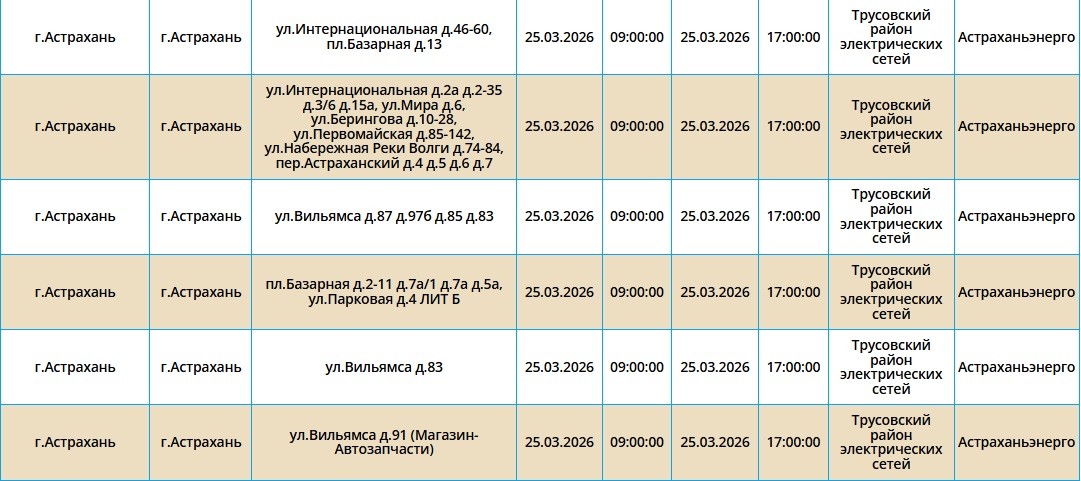 Новые отключения электричества в регионе пройдут уже завтра, 25 марта. Об этом сообщили в пресс-службе ПАО «Россети Юг». Так, света не будет в Ахтубинском и Харабалинском районах области. Отключения затронут и жителей Астрахани. Без электричества останутся дома и квартиры, детский сад, несколько котельных и ветеринарная станция. Самые ранние отключения начнутся в 09:00. Полный список адресов в галерее ниже: Все значимые данные о нынешних проблемах в сфере ЖКХ оперативно отображаются на интерактивной онлайн-карте. Здесь регулярно публикуются уведомления о перебоях в энергоснабжении, водоснабжении и иных коммунально-бытовых неудобствах. В случае внеплановых отключений рекомендуется звонить по указанным номерам телефонов:
