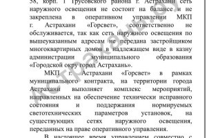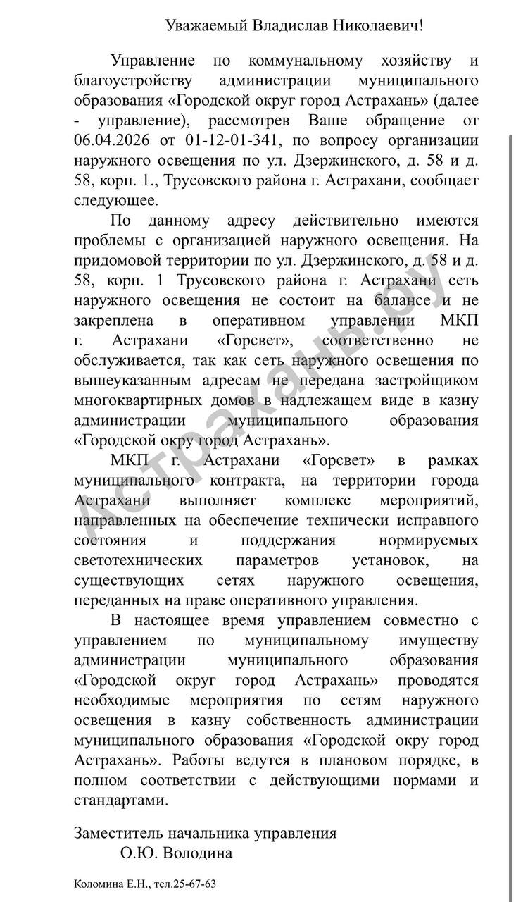 В Астрахани вновь поднимается тема, знакомая многим жителям: отсутствие уличного освещения и невозможность добиться конкретных решений от ответственных структур. В редакцию Астрахань.ру обратился местный житель, который уже более двух лет пытается добиться освещения в своем дворе - но пока получает отсутствие реальных действий. Астраханец написал в нашу редакцию с просьбой помочь привлечь внимание к затянувшейся проблеме отсутствия освещения во дворе по адресу: улица Дзержинского, дом 58 и дом 58 корпус 1. Мужчина подробно описал ситуацию, которая длится уже не первый год: «В нашем дворе полностью отсутствует уличное освещение по адресу: ул. Дзержинского д. 58 корпус 1. В прошлом году я направлял обращение в администрацию города, а также в «Горсвет Астрахань», однако обе инстанции перекладывают ответственность друг на друга. Прошу вашей поддержки в освещении этой проблемы. Дело не только в неудобствах для жителей, но и в безопасности в темное время суток». К обращению он также приложил скриншоты официальных ответов из различных инстанций, подтверждающие, что проблема действительно поднималась неоднократно. Редакция Астрахань.ру взяла ситуацию в работу и провела дополнительную проверку. Выяснилось, что сети наружного освещения по указанным адресам действительно не закреплены ни за одной обслуживающей организацией. В связи с этим в администрацию города был направлен официальный запрос с конкретными вопросами: какие решения были приняты по организации освещения на данном участке; планируется ли постановка территории на баланс профильной организации; предусмотрено ли строительство или подключение сетей наружного освещения; каковы возможные сроки выполнения этих работ. Ответ от администрации поступил, однако без какой-либо конкретной ясности: Да, это действительно полный текст официального ответа. Ни сроков, ни решений и без четкого понимания, когда именно проблема будет устранена. Нам так и не удалось получить уточнения по ключевым вопросам: будет ли территория поставлена на баланс и в какие сроки это произойдет. В связи с этим у нашей редакции возникают вполне закономерные вопросы. Почему жители вынуждены годами добиваться решения очевидной проблемы? И почему на официальные запросы СМИ становится все сложнее получить четкие и развернутые ответы? Безусловно, нельзя обобщать - есть ведомства и специалисты, которые дают подробные и понятные разъяснения. Однако в последнее время все чаще прослеживается тенденция к формальным ответам. Тем временем проблема остается нерешенной. Во дворе по улице Дзержинского, 58 и 58 корпус 1 по-прежнему нет освещения. А это - не только вопрос комфорта, но и безопасности жителей в темное время суток. Редакция Астрахань.ру обращает внимание профильных служб и органов власти на данную ситуацию и просит оперативно взять ее на контроль. Вопрос освещения - базовый для городской среды, и он не должен оставаться без решения годами.