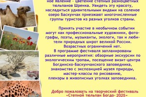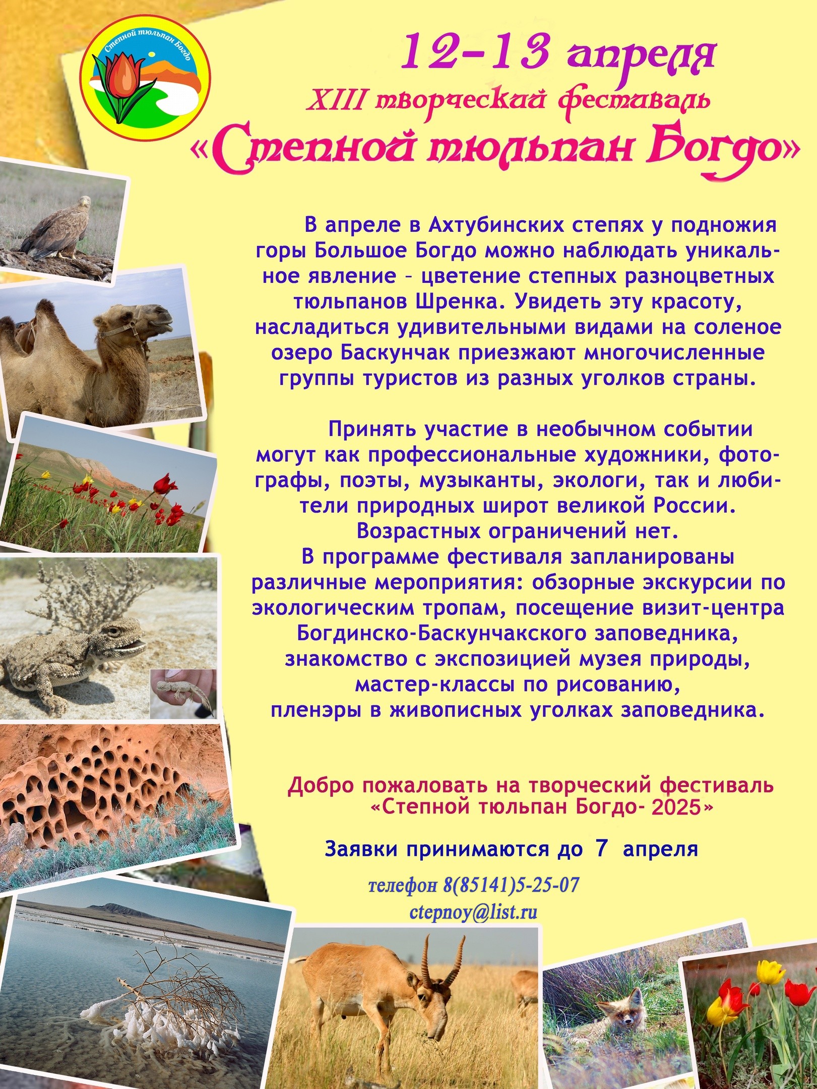 Традиционный творческий фестиваль с самым весенним настроением состоится в Ахтубинском районе, у подножия горы Большое Богдо. Масштабное событие организуют уже в 13-й раз. Предполагается, что на время проведения фестиваля придется пик цветения тюльпанов Шренка. Точно спрогнозировать этот процесс пока трудно, на него могут оказать влияние природные и другие факторы. Но в любом случае в ходе мероприятия можно будет не только полюбоваться на цветы. К участию приглашают художников, фотографов, поэтов, музыкантов, экологов и всех любителей природы. В программе запланированы различные активности, в том числе экскурсии по заповедным тропам, мастер-классы по рисованию и др. Участникам нужно подать заявки до 7 апреля, подробности по телефону: 8(85141)5‐25‐07.