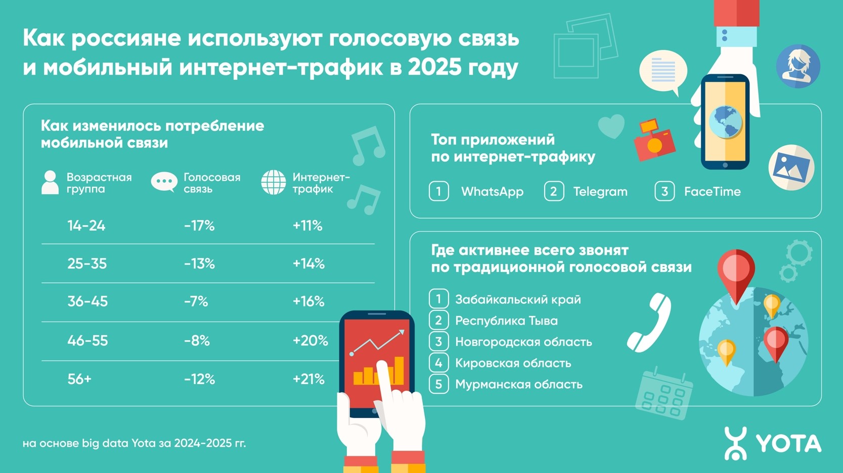 Жители Астраханской области все реже совершают телефонные звонки, предпочитая общение в мессенджерах. За год средний голосовой трафик на абонента снизился на 29%, а мобильная передача данных выросла на 43%. Интерес к классическим звонкам в основном падает у молодежи, при этом наиболее активно осваивать альтернативные способы связи начали пользователи старше 56 лет. К такому выводу пришли аналитики Yota на основе анализа обезличенных данных абонентов. Снижение интереса к классическим звонкам по всей стране особенно заметно у молодой аудитории. С января по май 2025 года у пользователей 14-24 лет средний объем голосового трафика упал на 17%, тогда как мобильный интернет-трафик вырос на 11%. Похожая динамика наблюдается и у миллениалов в возрасте 25-35 лет: традиционные звонки у них сократились на 13%, а мобильная передача данных выросла на 14%. Между тем всё активнее цифровые способы связи осваивает старшее поколение. У аудитории 56+ объемы «голоса» упали на 12%, а показатель интернет-трафика увеличился на 21%. Более консервативно ведут себя пользователи средних возрастов. У аудитории 36-45 лет голосовой трафик снизился на 7%, тогда как сетевой трафик вырос на 16%. Абоненты 46-55 лет стали на 8% реже использовать традиционную связь, при этом объемы передачи данных через интернет выросли на 20%. Между тем, к традиционным звонкам прибегают в основном мужчины — на них приходится 58% голосового трафика против 42% у женщин. При этом в мессенджерах пользователи чаще выбирают видеозвонки, а не их аудио вариант. В этом направлении безоговорочным лидером стал WhatsApp, на втором месте — Telegram. Тройку замыкает FaceTime, доступный для пользователей Apple. Эксперты Yota также составили рейтинг регионов, где жители остаются верны классической связи. Для этого был рассчитан средний объем голосового трафика на одного пользователя. Возглавил рейтинг Забайкальский край, где абоненты по-прежнему предпочитают звонки вне мессенджеров. В топ-5 также вошли Республика Тыва, Новгородская, Кировская и Мурманская области. В пресс-службе МегаФона подтвердили тренд. Как показывает big data оператора, год к году интернет-трафик мессенджеров в Астраханской области только прирастает. К примеру, объем видеозвонков через WhatsApp взлетает почти в два раза. Наиболее активны в мессенджерах жители региона в два периода — с 15:00 до 16:00 и с 21:00 до 22:00.