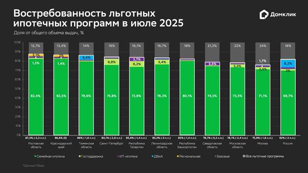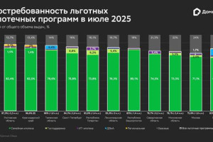 Аналитический центр Домклик в ежемесячном исследовании представляет обзор ключевых изменений на ипотечном рынке. В первой части эксперты анализируют данные о востребованности льготных и рыночных программ в июле 2025 года. Рекордные выдачи по льготным программам Объем выдач по льготным программам в июле достиг 187,6 млрд руб., что стало максимальным результатом в 2025 году. Больший объем льготных выдач был зафиксирован лишь в июне 2024 года – 354 млрд руб., однако впечатляющие показатели июня объясняются ажиотажным спросом накануне отмены массовой льготной ипотеки в июле 2024 года. Доля льготной ипотеки в июле незначительно снизилась до 82% (-2 п.п.), однако спрос на программы с господдержкой остаётся высоким, продолжая тренд первого полугодия 2025 года. За исключением января, в 2025 году средняя доля льготных программ на рынке стабильно превышает 80%. Рост спроса на Семейную ипотеку Объем выдач по Семейной ипотеке также показал значительный рост: в июле Сбер выдал 159,2 млрд руб., что на 15% больше, чем в июне 2025 года. Если смотреть на годовую динамику (июль 2025 к июлю 2024), то выдачи по Семейной ипотеке и вовсе выросли более чем в два раза – на 110%. Доля Семейной ипотеки увеличилась на 0,6 п.п. по сравнению с июнем 2025 года, приблизившись к 70% от всего рынка. Наиболее высокая доля Семейной ипотеки в выдачах стабильно наблюдается в Республике Хакасия (91,9%) и Республике Адыгея (91,1%). Третье место у Астраханской области, где на господдержку семей с детьми пришлось более 87% всех выдач. Среди регионов-лидеров по объёму выдач (представлены на инфографике) высокая доля выдач по Семейной ипотеке отмечается в Краснодарском крае (82,5%) и Ростовской области (82,4%). Другие льготные программы Рекордный спрос зафиксирован и на Дальневосточную и Арктическую ипотеку (ДВиА). В июле по этой программе Сбер выдал около 19 млрд рублей – чуть больше за последние два года было только в августе 2024 года: 19,2 млрд. Доля Дальневосточной и Арктической ипотеки в этот раз составила 8,2%, а в целом на протяжении года доля ДВиА колеблется в диапазоне 7-9%. По доле от общего объёма выдач ДВиА преобладает в Бурятии (80%), Якутии (76,4%) и Амурской области (71,8%). Среди регионов, представляющих Арктическую зону России, сравнительно высокая доля выдач по ДВиА отмечена в Архангельской области – 64,7%. Снижение спроса отмечено по ИТ-ипотеке: объём выдач сократился на 16,4% до 3,9 млрд. В июле 2025 года лидерами по доле ИТ-ипотеки от общего объёма выдач стали Томская (7,2%) и Новосибирская область (6,7%). Рыночная ипотека: рост в условиях высокой ключевой ставки Доля рыночных программ в июле увеличилась на 2 п.п., достигнув 18%. Выдачи по рыночным ипотечным программам выросли почти на 32%, превысив 41 млрд рублей. Всего с начала года объёмы выдач по базовой ипотеке увеличились почти в 4 раза, что демонстрирует адаптацию данного сегмента к существованию в условиях высокой ключевой ставки. Как и ранее, около 60% рыночных ипотечных выдач приходится на вторичное жильё. Наибольшая доля рыночных программ характерна для регионов с низкими объёмами строительства. В лидерах по июлю – Карачаево-Черкесская Республика (36,1%), Омская (33,2%) и Саратовская (32,7%) области. Методология: как считали аналитики С января 2025 года оценка востребованности льготных ипотечных программ изменилась: сейчас аналитики оценивают данные по объёму выделенных средств на ипот