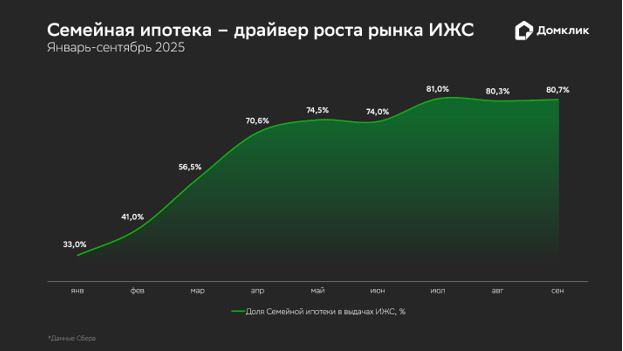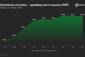 По словам Алексея Лейпи, директора департамента «Домклик» Сбербанка, в III квартале объёмы ипотечного кредитования на строительство частных домов увеличились в 4 раза по сравнению с I кв. 2025 года. Ситуация в сегменте ИЖС была непростой во второй половине 2024 года, когда прекратилось действие программы Господдержка 2020. В этих условиях важную роль стала играть программа Семейная ипотека. Начиная с апреля на эту программу приходилось от 70% до более 80% от всего объёма выдач по ИЖС, что оказало поддержку семьям с детьми, желающим улучшить свои жилищные условия. Рост объемов кредитования ИЖС По итогам третьего квартала общая сумма кредитов на индивидуальное жилищное строительство, выданных Сбером с начала 2025 года, превысила 100 млрд рублей. Причем именно третий квартал стал рекордным – было выдано более половины от этой суммы, 51 млрд рублей. Таким образом, рост по сравнению с первыми тремя месяцами года составил 300%. Существенную долю в выдаче ипотеки на ИЖС занимают программы господдержки, причем абсолютное большинство кредитов во втором и третьем кварталах пришлись на Семейную ипотеку. Объемы выдач по этой программе нарастали по мере приближения весенне-летнего сезона. Кроме того, с 1 марта 2025 года вступил в силу закон по ИЖС с использованием счетов эскроу, который значительно повысил безопасность проведения сделок и прозрачность строительства. Так, если в январе 2025 года только 33% всех средств на ИЖС приходилось на льготные кредиты для молодых семей с детьми, то в июле доля «Семейной ипотеки» достигла пика в 81%. В августе и сентябре доля программы оставалась на высоком уровне – 80,3% и 80,7% соответственно.