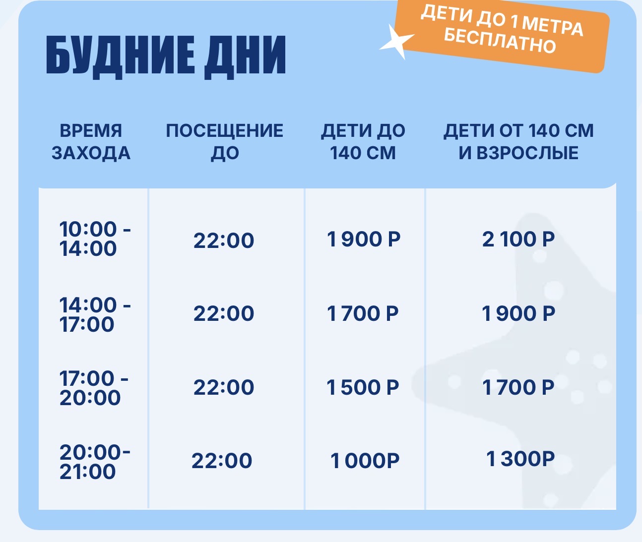 В 2025 году в Астрахани пройдет долгожданное открытие аквапарка «Жемчужина», который расположен возле микрорайона Бабаевский. На данный момент известно, что площадь объекта составляет 8 тысяч квадратных метров. Астраханцам обещают более 10 видов водных горок. Одновременно находиться в аквапарке смогут до 500 человек. А сейчас на официальном сайте организации также опубликовали актуальный прейскурант. Так, полный будний день в аквапарке, с 10:00-14:00 до 22:00, будет стоить 2100 рублей, детям ниже 140 сантиметров полагается скидка в размере 200 рублей. Чем меньше времени будет проведено в аквапарке, тем, соответственно, дешевле. А вот в выходные дни цены увеличиваются на 200 рублей. Детям, рост которых менее 1 метра, можно купаться бесплатно. Подробнее с ценами предлагаем ознакомиться ниже: В стоимость билета включен доступ ко всем аттракционам комплекса: водным горкам, бассейнам, зоне спа (сауны, гидромассажный бассейн). Приобрести билеты можно в кассе аквапарка. Что касается правил помещения, то они следующие: Несовершеннолетние (до 18 лет) допускаются в аквапарк только в сопровождении совершеннолетних. 1 взрослый может сопровождать не более двух детей в возрасте до 5 лет. 1 взрослый может сопровождать группу не более 4 детей в возрасте от 5 до 18 лет, двое из которых достигли 14 лет. Запрещено посещать аквапарк лицам с инфекционными, острыми вирусными, контагиозными кожными и венерическими, грибковыми заболеваниями, а также с открытыми ранами, конъюктивитом и гельминтозом. Также не пропустят в аквапарк и людей в состоянии алкогольного или наркотического опьянения. Не получится пронести и еду. В новом астраханском аквапарке провели тест-драйв горок
