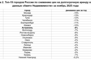 Рынок долгосрочной аренды в Астрахани заметно остыл. По итогам ноября 2025 года город вошел в топ-7 российских городов с самым ощутимым снижением стоимости аренды жилья за год. За последний месяц аренда квартир в Астрахани подешевела сразу на 10% - это один из самых значительных показателей в стране. Быстрее цены снижались лишь в нескольких городах, а в целом по России падение составило в среднем 3%. Год к году медианная стоимость аренды в стране снизилась на 1,3%. Такие данные представила платформа «Авито Недвижимость». Одной из ключевых причин снижения цен стал рост предложения. В Астрахани за год выбор квартир для долгосрочной аренды увеличился на 24%. Особенно заметно прибавилось однокомнатных квартир - сразу на 53%, а также трехкомнатных - на 15%. Это дало арендаторам больше возможностей для выбора и усилило конкуренцию среди собственников. Интерес к аренде жилья в регионе при этом сохраняется. За год спрос в Астрахани вырос на 8%, а на однокомнатные квартиры - сразу на 27%. Именно «однушки» остаются самым востребованным форматом: на них приходится более половины всех просмотров объявлений. Средняя стоимость долгосрочной аренды квартиры в Астрахани по итогам ноября составила 31,3 тысячи рублей в месяц. Это ниже, чем в ряде крупных городов страны, но выше, чем в регионах с самым доступным жильем - таких как Киров или Ульяновск. Эксперты отмечают, что в этом году рынок аренды прошел осенний сезон без резких скачков цен. По словам руководителя категории долгосрочной аренды «Авито Недвижимости» Константина Каменева, предложение росло быстрее спроса, дефицита жилья не возникло, а многие арендаторы предпочли не менять место проживания, чтобы избежать дополнительных расходов. Кроме того, часть потенциальных съемщиков начала рассматривать покупку жилья на фоне снижения ключевой ставки.