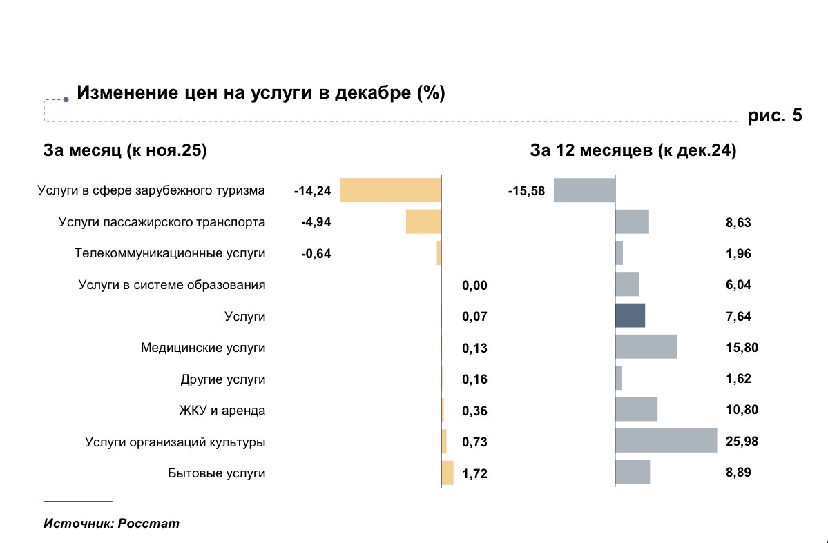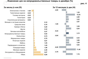 В декабре 2025 года цены в Астраханской области выросли на 0,41% к ноябрю. Годовая инфляция, при этом, замедлилась и составила 5,25%. Это ниже, чем в целом по стране. Заметнее всего в декабре выросли цены на непродовольственные товары. Так, в цене выросла теплая обувь. Это позволило продавцам перенести в цены возросшие расходы на логистику, оплату труда и аренду помещений. Подорожали оборудование, мебель и инструменты. При этом, снизились цены на электронику и бытовую химию. Магазины в преддверии новогодних праздников объявляли скидки на стиральные машины, пылесосы. Продовольственные товары подорожали менее ощутимо. На прилавках преобладали огурцы, сладкий перец, выращенные в теплицах. Из-за затрат на отопление и свет плодоовощная продукция в декабре сезонно подорожала. Вырос спрос и на овощи открытого грунта - свеклу, картофель и морковь. Но есть и хорошая тенденция - за год плодоовощная продукция снизилась в цене на 9,83%. Подорожали и кондитерские изделия. В то же время уменьшились цены на сыр и сливочное масло. Их себестоимость снизилась, так как молоко подешевело в результате расширения его предложения. Также в декабре выросли цены на бытовые услуги. Это связано с ростом издержек поставщиков на закупку сырья и инструментов, обслуживание оборудования, аренду помещений и оплату труда. Подорожало посещение кинотеатров из-за роста расходов на зарплату и аренду помещений. Но снизились цены на услуги в сфере зарубежного туризма. Также, в связи с окончанием сезона высокого спроса, наблюдалось снижение цен на поездки в Египет, Турцию, ОАЭ. Цены в Астраханской области в декабре выросли на 0,41%, в целом по России – на 0,32%. Больше, чем в стране, в регионе подорожали обувь, инструменты и оборудование. Годовая инфляция в области замедлилась и стала ниже, чем в стране. За 12 месяцев подорожали продовольственные и непродовольственные товары больше, чем в целом по стране. А вот цены на услуги в регионе за год выросли меньше, чем в среднем по России. Инфографика: Банк России