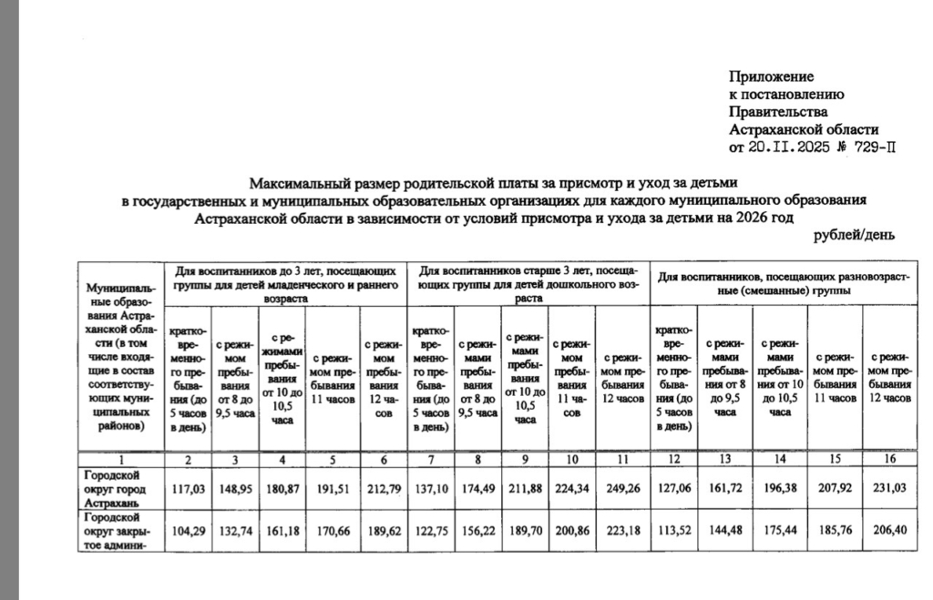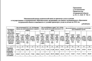 Астраханская мэрия утвердила новые размеры родительской платы за посещение детских садов в 2026 году. По сравнению с прошлым годом средняя стоимость увеличилась почти на 30 рублей в день. Для групп с 12-часовым пребыванием детей плата составит: 212,79 рубля в день - для малышей до 3 лет; 249,26 рублей в день - для детей от 3 до 7 лет; 231,03 рубля в день - для разновозрастных групп. В постановлении уточняется, что указанная плата включает не только присмотр и уход за детьми, но и расходы на приобретение необходимых материалов и хозяйственно-бытовое обслуживание детских садов. Читайте также: Стало известно, в каком районе Астраханской области плата за детский сад самая низкая Размер родительской платы зависит от возраста ребенка, типа группы и режима пребывания. Подробности о тарифах доступны в галерее ниже:
