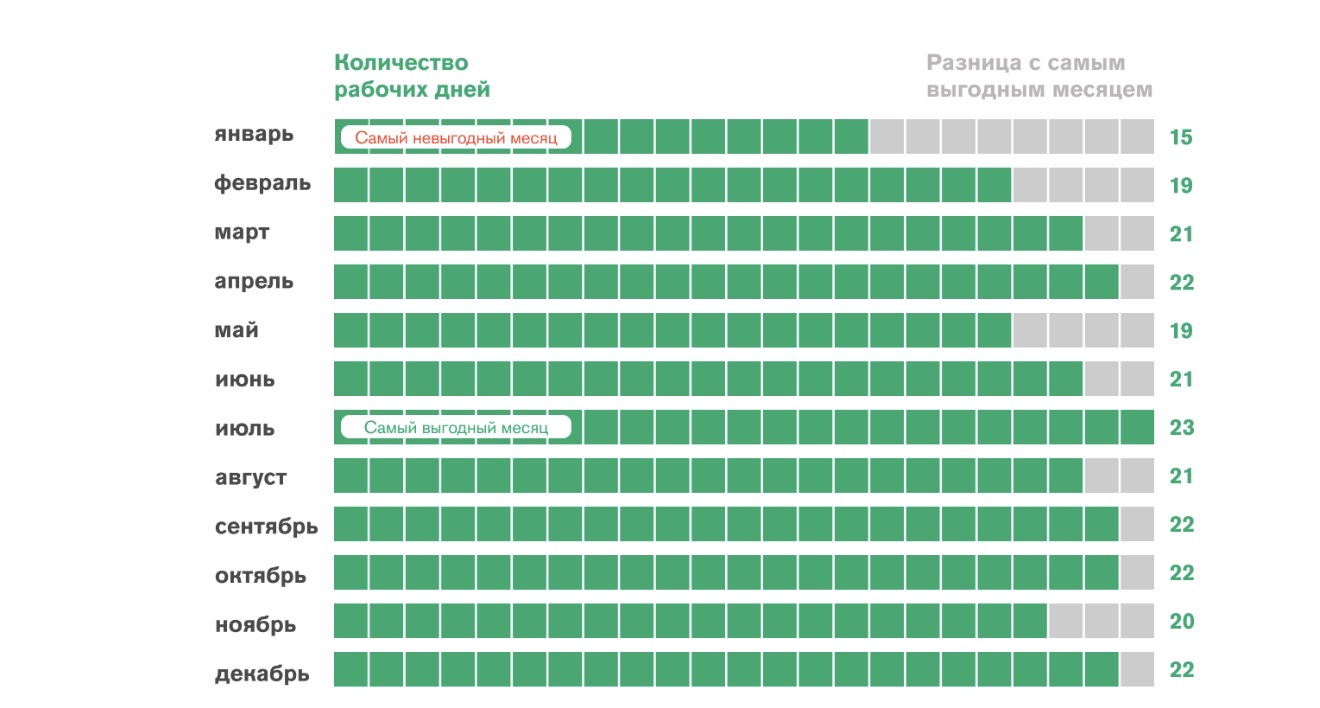 Аналитики сервиса SuperJob объясняют, когда сотрудникам, работающим по стандартному графику пятидневки и получающим фиксированный оклад, выгоднее всего идти в отпуск в 2026 году. Наиболее благоприятный месяц для отпуска - июль. Отпускные выплаты в этот период достигают своего максимума. Напротив, наименее подходящий месяц - январь. Решив отправиться отдыхать именно тогда, сотрудник рискует столкнуться с потерей денег по сравнению с обычной зарплатой. Таким образом, январские рабочие дни принесут больше дохода, чем получение отпускных. Причина различий кроется в количестве рабочих дней каждого месяца. Чем меньше рабочих дней, тем менее выгодной становится возможность уйти в отпуск. Это связано с тем, что несмотря на разницу в продолжительности рабочей недели, зарплата остается неизменной. К примеру, предположим, что ежемесячный оклад составляет 100 тысяч рублей. В январе, имея лишь 15 рабочих дней, средняя стоимость одного рабочего дня составит около 6666,67 рубля. Тогда как в июле, с его 23 рабочими днями, тот же показатель снизится до 4347,83 рубля. Так как отпуск рассчитывается исходя из среднего уровня зарплаты, то решение относительно оптимального периода для отпуска зависит от сопоставления стоимости рабочего дня в конкретном месяце со средним показателем оплаты труда за один рабочий день. Там, где значение первого показателя превышает второй, целесообразнее оставаться на работе. А вот если ситуация обратная либо значения близки друг другу, отпуск окажется финансово оправданным выбором. Исходя из вышеуказанных соображений, были определены лучшие и худшие месяцы для ухода в отпуск в 2026 году. Среди лучших выделяются июль, апрель, сентябрь, октябрь и декабрь. Худшими стали январь, май и февраль. Уход в отпуск в течение последних двух чреват финансовой потерей по сравнению с работой и получением обычного жалованья. Остальные месяцы характеризуются умеренной степенью финансового риска при уходе в отпуск. Отдельно стоит отметить, что если перед сотрудником стоит цель увеличить продолжительность установленных законом выходных дней, то наибольшего эффекта удастся достичь, используя отпуск в сочетании с официальными выходными в мае. Например, присоединение части отпуска к новогодним каникулам обеспечит длительный отдых. Тем не менее, важно помнить, что такие решения могут привести к уменьшению размера отпускных выплат.