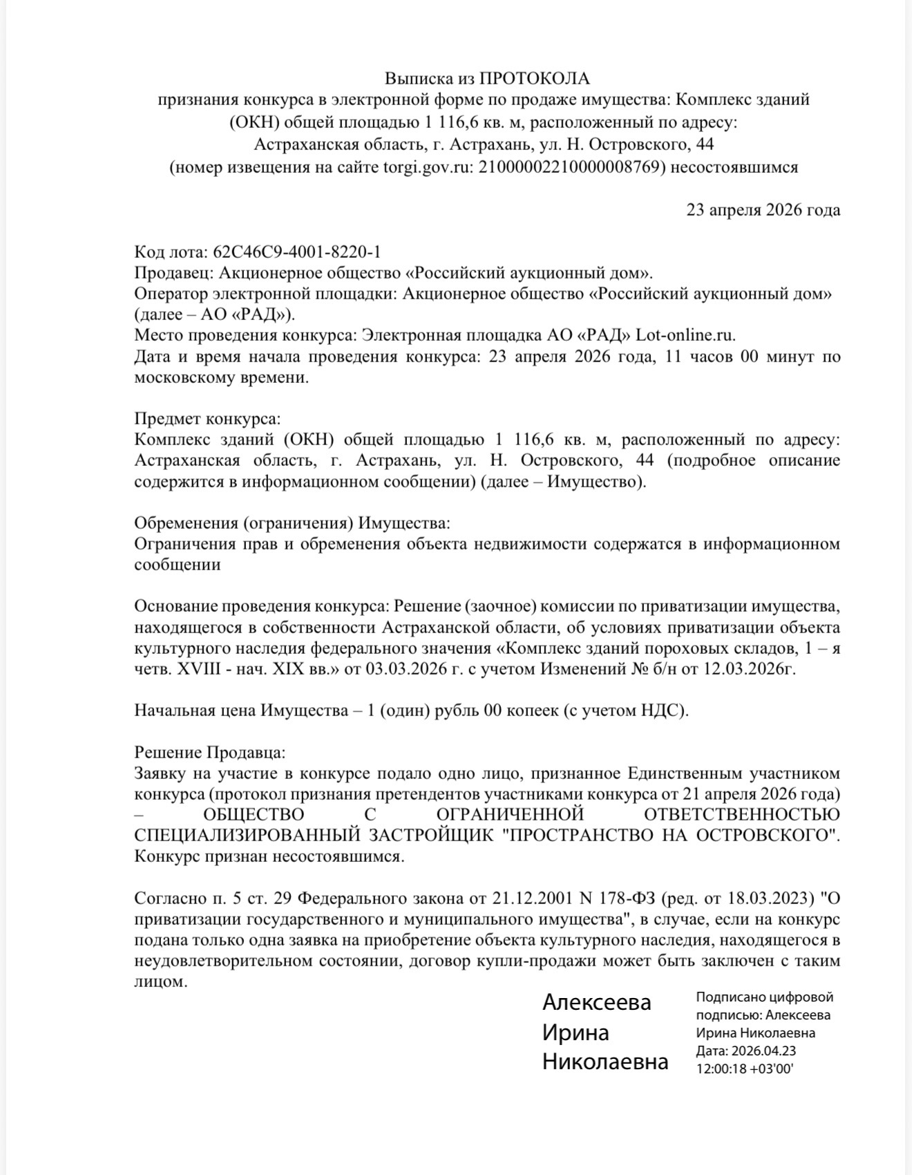 В прошлом году памятник федерального значения - комплекс зданий пороховых складов XVIII–XX веков выставили на аукцион. Начальная стоимость составляла всего 1 рубль. Тогда считали, что аукцион будет напряженным и захватывающим. Оно и понятно, такой объект за такие деньги. Но этого не случилось - желающих не было вплоть до апреля текущего года. Напомним, что на электронный аукцион был выставлен комплекс из четырех объектов: трех складских корпусов и караульного помещения. Несмотря на кадастровую стоимость в 2,4 миллиона рублей, начальная цена торгов символическая - всего 1 рубль. Победителем должен был стать тот, кто предложит наибольшую сумму. Минимальный шаг аукциона составляет 121,8 тысячи рублей (5% от кадастровой стоимости). Вместе со зданиями новый собственник получит и земельный участок, который будет оформлен в аренду. Арендная плата за землю - 1 рубль в год на протяжении всего срока действия договора. В первоначальном проекте предполагалась не только реставрация складских зданий, но и комплексное благоустройство прилегающей территории. Здесь планировалось создать тематический парк, главным акцентом которого должна была стать мемориальная стела в память о подвиге советского народа в Великой Отечественной войне. В парке хотели обустроить зону исторической реконструкции и площадку с образцами военной техники. Территорию собирались озеленить, высадив клены, спирею, можжевельник и другие декоративные растения. Кроме того, проект предусматривал установку фонтана, размещение малых архитектурных форм и создание комфортного общественного пространства. Читайте также: Астраханские «Пороховые склады» пойдут на продажу за 1 рубль Последний аукцион завершился накануне, 23 апреля. Он в очередной раз признался несостоявшимся. Вместе с тем, заявку все же подала одна компания ООО СЗ «Пространство на Островского». «Согласно п. 5 ст. 29 Федерального закона от 21.12.2001 N 178-ФЗ (ред. от 18.03.2023) «О приватизации государственного и муниципального имущества», в случае, если на конкурс подана только одна заявка на приобретение объекта культурного наследия, находящегося в неудовлетворительном состоянии, договор купли-продажи может быть заключен с таким лицом», - указано в документе. Кстати, этот же застройщик также выкупил территорию под бывшей «Долиной Кентавра». Ранее был заказан план межевания территории для объединения нескольких участков, а уже сейчас там готовится площадка для строительства. Проект будущего ЖК пока не разглашается, однако известно, что застройщику разрешено возводить до 30 этажей. А вот зону культовых сооружений под застройку не отдадут. Ее можно только восстановить. Неужели таким образом застройщик решил благоустроить территорию возле жилого комплекса? Похвально. «Нам, кстати, сказали, что не будет 30 этажей. До 20, кажется, управятся. Хочет застройщик и территорию «Пороховых складов» выкупить? Но это слухи среди соседей пока что. Говорят, будет парк для горожан, ну и новым жильцам красивый вид вместо разрухи. Вряд ли бы квартиры покупали рядом с заброшками. Как минимум, неэстетично, как максимум - небезопасно», - рассказала жительница улицы Магаданской. Так что, Советский район преображается. Так и должно быть. Застройщикам мало просто возвести дом, нужно комплексно благоустраивать территорию. Так случилось и на улице Николая 