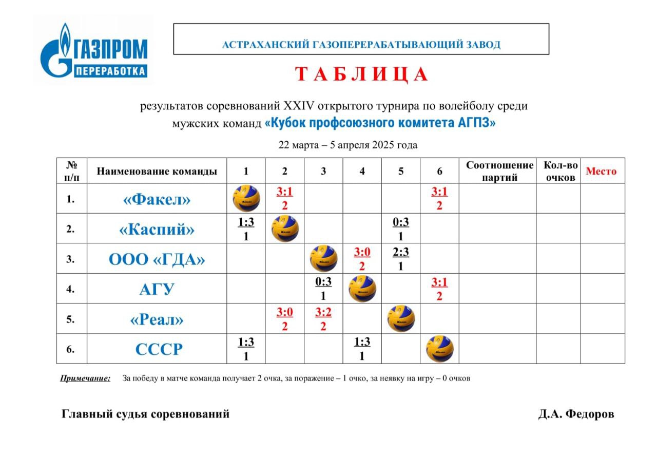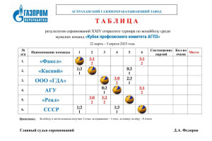 Сегодня, 5 апреля, пройдут матчи XXIV открытого турнира по волейболу среди мужских команд «Кубок профсоюзного комитета АГПЗ». На данный момент таблица результатов соревнований выглядит следующих образом: Прямо сейчас поболеть за любимую команду дистанционно и посмотреть матч можно на сайте ASTRAKHAN.RU SPORT, а также на телеканале в сетях «Реал» и «АЦТ».