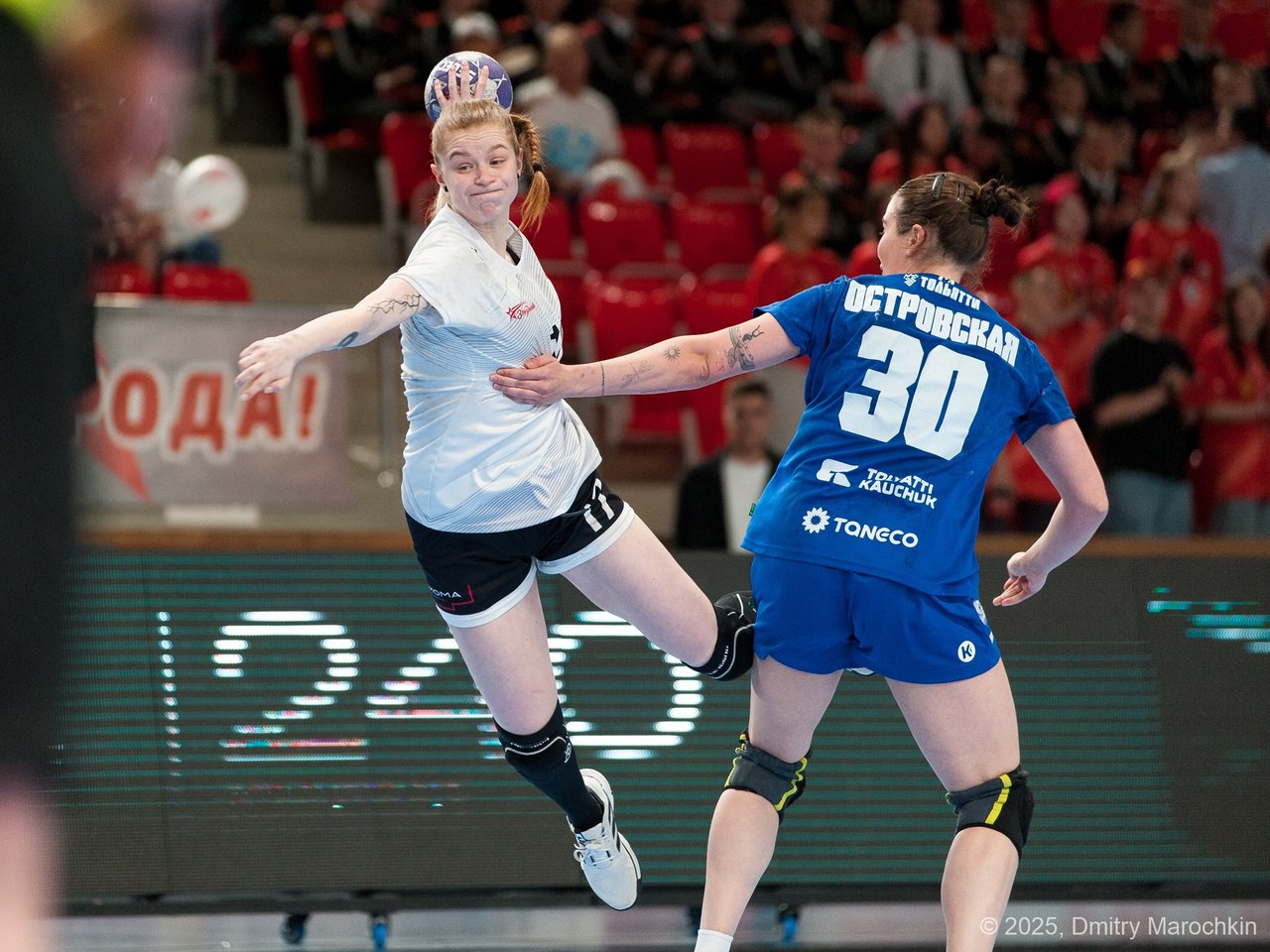 «Астраханочка» второй год подряд вошла в число четырех сильнейших команд. В прошлом году дружина Михаила Измайлова завоевала бронзовые медали, в этом сезоне также наши девушки ведут борьбу за третье место. К сожалению, в полуфинале никакого сопротивления «Астраханочка» не смогла оказать «Ростов-Дону», проиграв оба матча, что называется, по всем статьям. Поэтому приходится довольствоваться играми за третье место. Правда, соперник, в отличие от прошлого сезона, другой - тольяттинская «Лада», которая сенсационно выбила из борьбы за медали «Черноморочку». Первая игра команд прошла в спорткомплексе «Звездный» и, как всегда, собрала большое количество зрителей. С первых минут астраханки пошли в наступление и к пятой минуте повели со счетом 3:0 благодаря двум голам Яны Сотниковой и заброшенному мячу Анны Кайнаровой. Однако соперник не так прост - вскоре тольяттинские гандболистки отыграли два мяча. Догнать хозяек «Ладе» удалось на 20-й минуте благодаря усилиям Натальи Решетниковой и Ольги Фоминой - 8:8. Но тут у астраханок раззабивались Ирина Гинкарук и Карина Сисенова, и хозяйки вновь убежали вперед на 4 мяча. Итог первого тайма - 17:14 в пользу «Астраханочки». После перерыва примерно до середины тайма счет варьировался от трех до четырех мячей. Но неудачная пятиминутка в середине тайма свела на нет все надежды «Лады» на благоприятный исход поединка - 28:20. И в победе дружины Михаила Измайлова уже мало кто сомневался. Так оно и вышло. Единственное, что удалось сделать «Ладе», - отыграть пару мячей. Но в полуфиналах разница мячей вообще не играет никакой роли - соперничество идет до двух побед одной из команд. Итог нынешнего матча - 33:27 в пользу «Астраханочки». Самой результативной в игре стала Яна Сотникова - на ее счету 9 голов. Ровно столько же раз броски полусредней «Астраханочки» не достигали цели. По 5 голов забросили Виктория Ковшикова («Астраханочка»), Наталья Решетникова и Ольга Фомина (обе - «Лада»). Но призы лучших игроков после матча достались обеим вратарям - астраханке Анастасии Рябцевой, отразившей 19 бросков из 46 (что составляет 41%), и Юлие Кунцевич из «Лады», парировавшей 18 бросков из 49 (36%). Вторая игра состоится в столице Автоваза 24 мая. Если «Ладе» удастся взять реванш, то решающая игра состоится в Астрахани 31 мая.