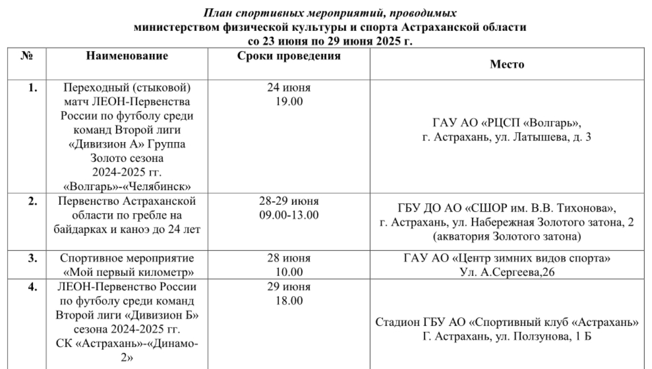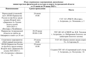 В пресс-службе Министерства физической культуры и спорта Астраханской области опубликовали план-график мероприятий, которые пройдут с 23 по 29 июня. Так, местных жителей и гостей региона приглашают на переходный матч ЛЕОН-первенство России по футболу среди команд Второй лиги «Дивизион А», первенство региона по гребле на байдарках и каноэ до 24 лет, спортивное мероприятие «Мой первый километр», ЛЕОН-первенство России по футболу среди команд Второй лиги «Дивизион Б». Подробности ниже: