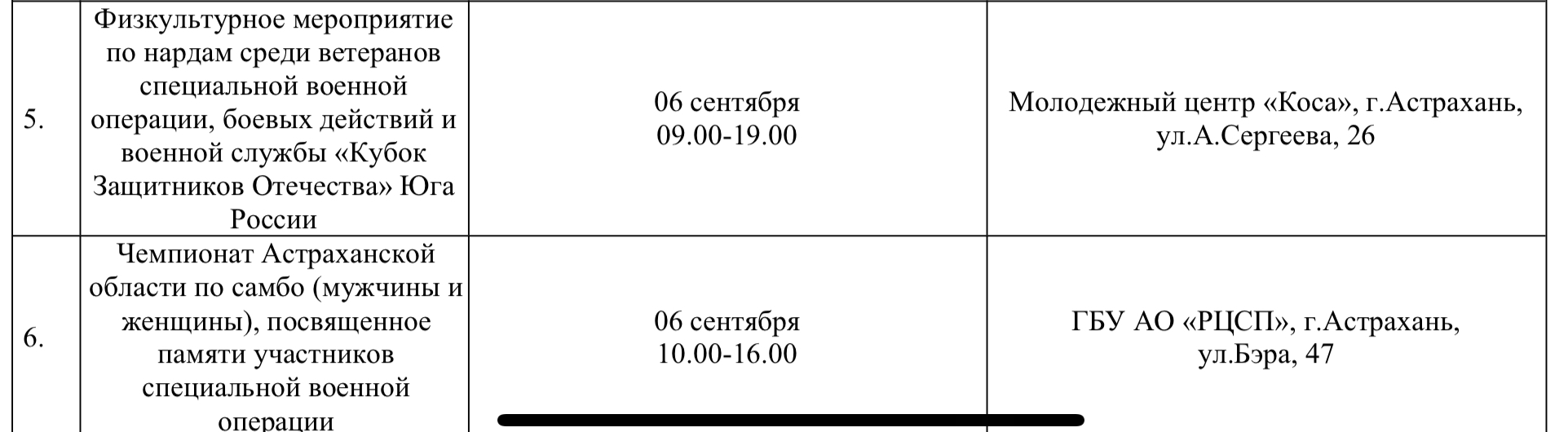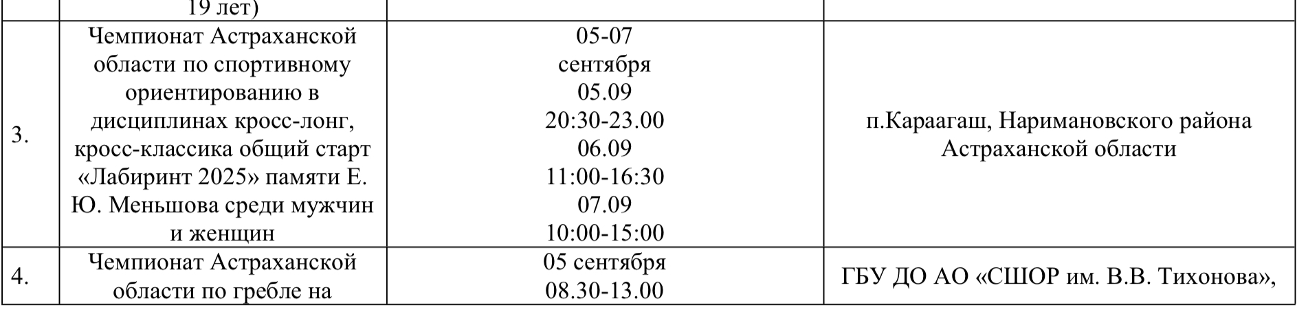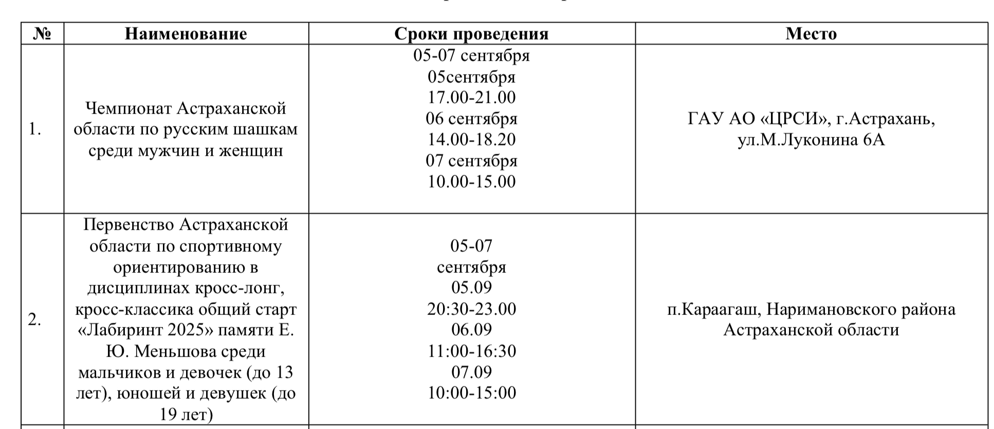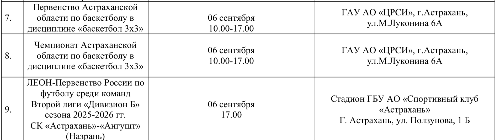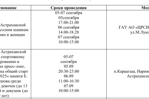 В министерстве физической культуры и спорта Астраханской области опубликовали план-график мероприятий, которые пройдут с 1 по 7 сентября. Так, местных жителей и гостей региона ждут Чемпионат области по русским шашкам, Первенство региона по спортивному ориентированию в дисциплинах кросс-лонг, физкультурное мероприятие по нардам, Чемпионат Астраханской области по самбо, баскетболу, и многое другое. Подробности ниже:
