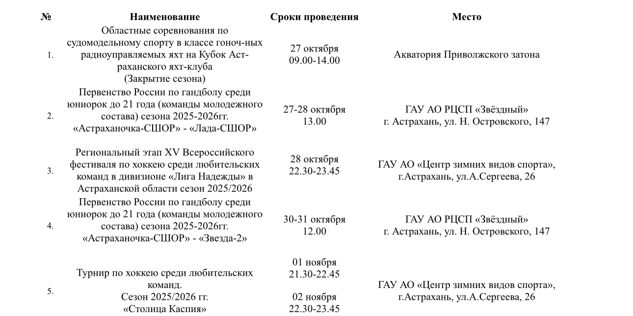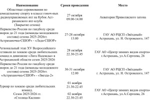 В Министерстве спорта и физической культуры опубликовали план-график мероприятий, которые пройдут на неделе с 27 октября по 2 ноября. Астраханцев и гостей региона ждут областные соревнования по судомодельному спорту в классе гоночных радиоуправляемых яхт, первенство России по гандболу среди юниорок до 21 года, региональный этап фестиваля по хоккею, спортивное мероприятие «Мой первый километр», турнир по хоккею среди любительских команд и многое другое: