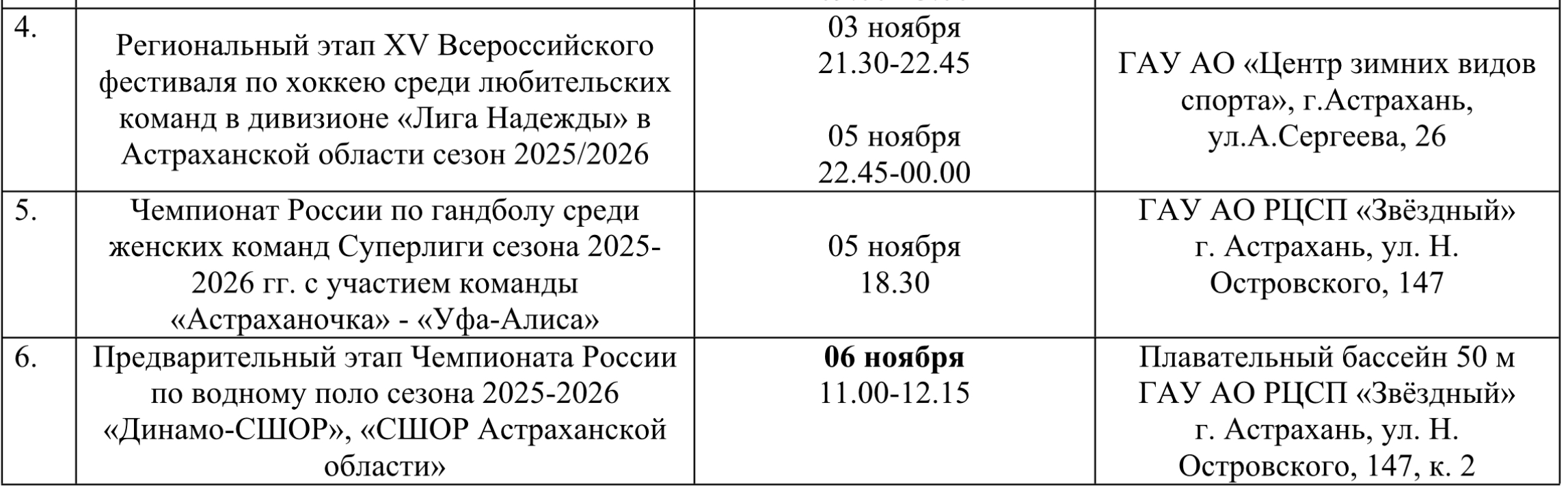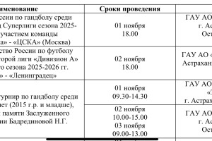 В Министерстве физической культуры и спорта подготовили план-график мероприятий, которые пройдут в регионе с 3 по 9 ноября. Астраханцев и гостей области приглашают на турнир по гандболу среди девочек, первенство России по футболу, предварительный этап Чемпионата России по водному поло, всероссийский фестиваль по хоккею и многое другое: