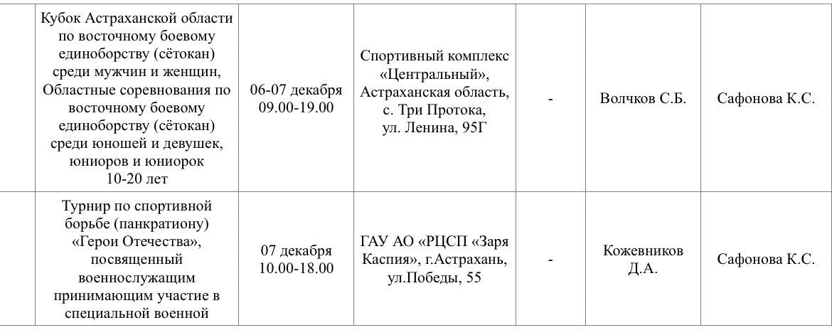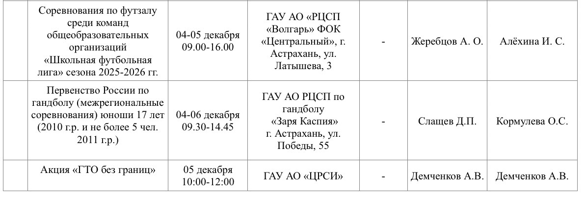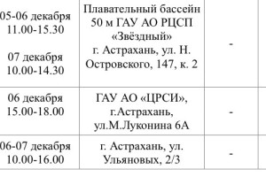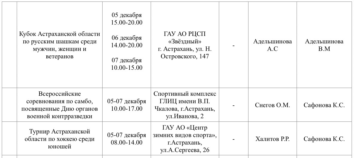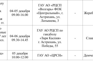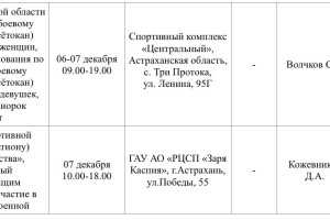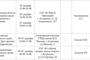В пресс-службе Министерства физической культуры и спорта Астраханской области опубликовали план-график мероприятий, которые пройдут на неделе с 1 по 7 декабря. Так, местных жителей ждут первенство России по гандболу, турнир по хоккею, первенство области по настольному теннису, акция «ГТО без границ», всероссийские соревнования и первенство Астраханской области по самбо и многое другое. Подробности в галерее ниже: