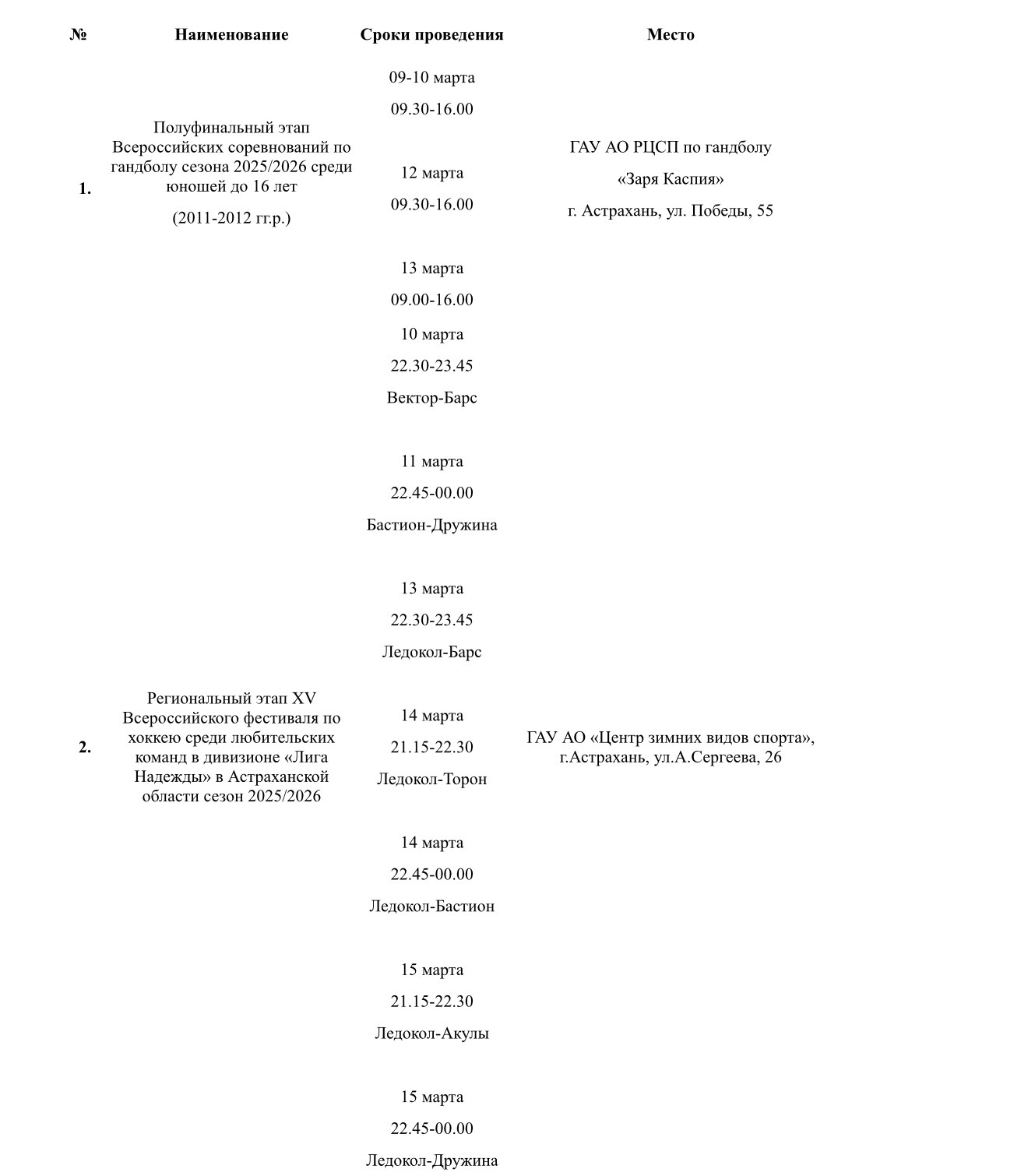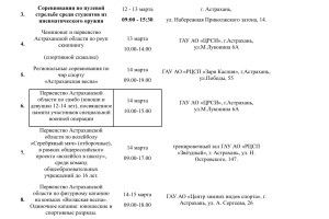 Министерство физической культуры и спорта подготовило план-график мероприятий, которые пройдут в Астраханской области с 9 по 15 марта. Так, местных жителей и гостей региона ждут Всероссийские соревнования по гандболу, фестиваль по хоккею, региональные соревнования по чир спорту, первенство области по фигурному катанию и многое другое. Подробности в галерее ниже: