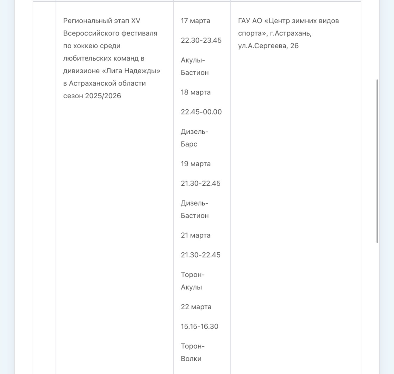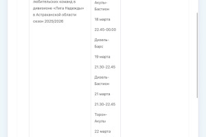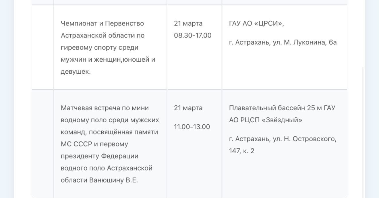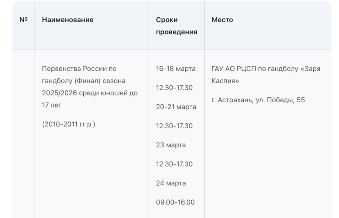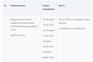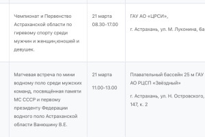 В Министерстве физической культуры и спорта Астраханской области опубликовали план-график состязаний, которые пройдут с 16 по 22 марта. В регионе пройдут Первенство России по гандболу, областной этап Всероссийского фестиваля по хоккею, Всероссийский марафон «Зарядка Героя», первенство России по водному поло, турнир по хоккею среди любительских команд. Подробности в галерее ниже: